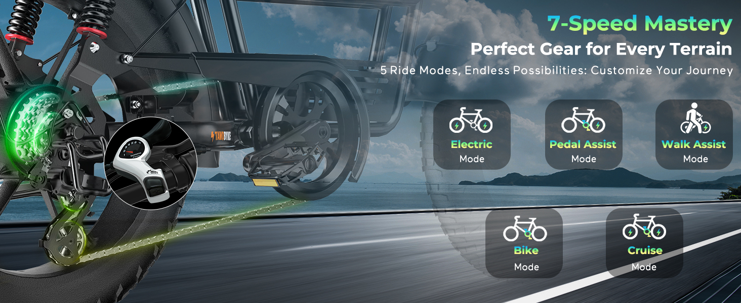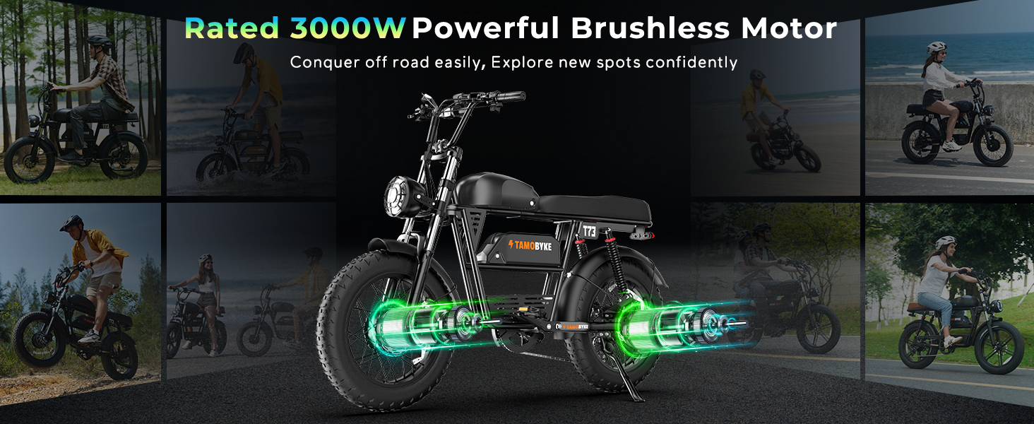 【5 Motor's Speed Shift】Tamobyke T73promax electric bike is equipped with a robust double 1500W motor (3000W peak) delivering thrilling acceleration up to 37.5 MPH, effortlessly conquering 35° steep slopeswith(with pedal-assist mode). Its professional 7-pedal assist gear system ensures Off-Road mastery across trails, and rugged terrain, transforming every ride into an adrenaline-charged adventure. Perfect for thrill-seekers craving an urban riding.