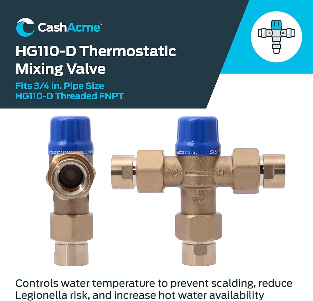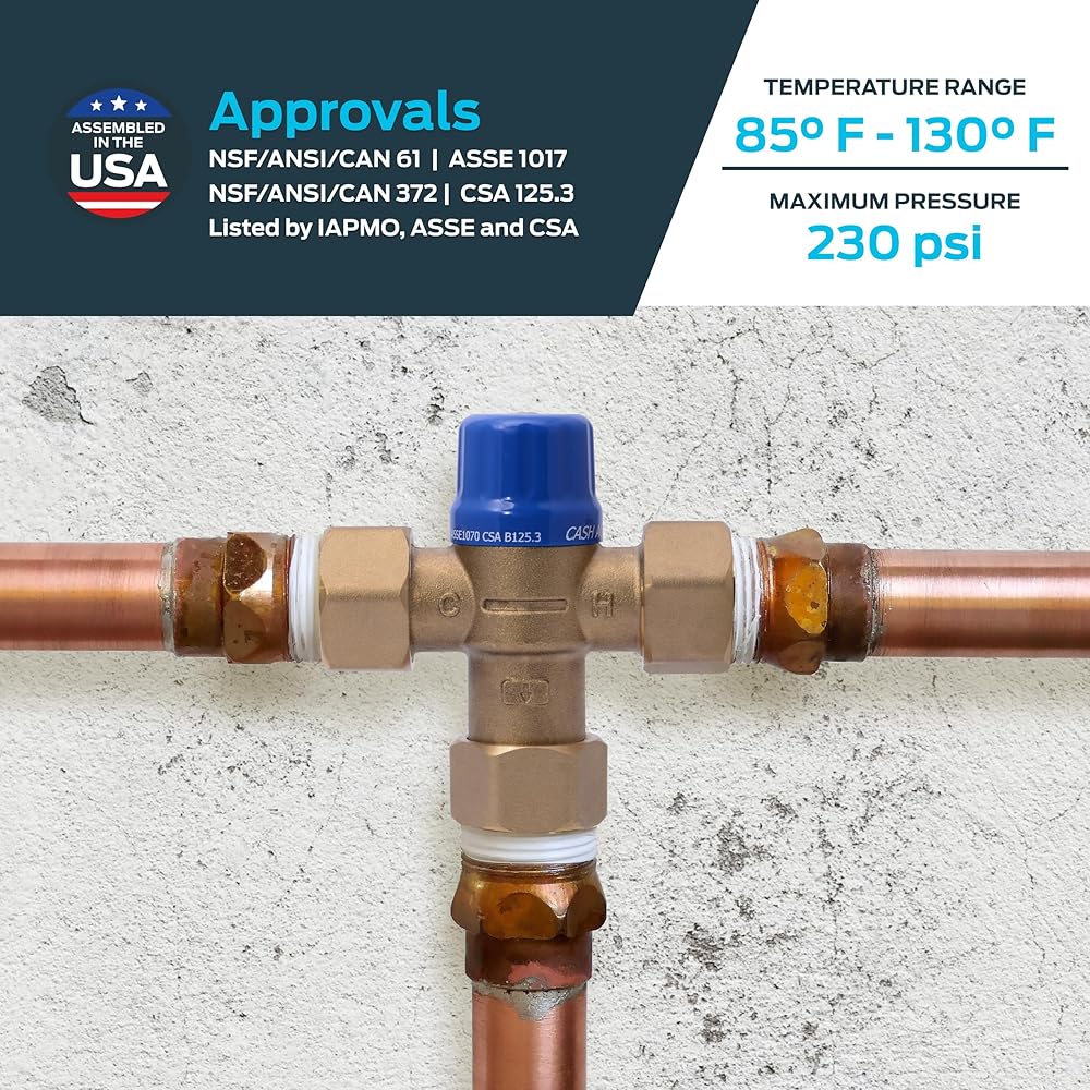 CASH ACME THERMOSTATIC MIXING VALVE: This triple-listed thermostatic mixing valve delivers water at a safe 120 degrees F or lower from all outlets, while allowing the water heater to be set at 140 degrees F or higher