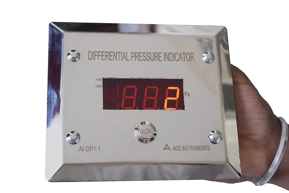 Differential Pressure Indicators are digital readout differential pressure gauges suited for application in laminar air flow cabinets, clean rooms, biosafety cabinets, AHU, etc. Differential pressure indicators are part replacement for the analog magnahelic gauges & are easy to use with clear 4 digit led display. It comes with built in sensor & also a buzzer alarm with acknowledgement facility for process violation alert. Salient features include unit conversion at the press of a key between mm.w.c. & Pascals, integrated buzzer alarm for set point violation, offset provision io meet audit requirements, 30 mm. Depth for clean room modular wall fitment & RS 485 modbus communication for BMS / SCADA / PLC integration. Ace Instruments LED pressure indicator for filter performance testing, digital manometer for clean air and ventilation systems, precision pressure sensor for pharmaceutical and laboratory use, AI-DP1-LED differential transmitter for air handling and BMS systems, industrial pressure measurement device for automation control, Ace Instruments pressure transmitter for cleanroom and filter monitoring