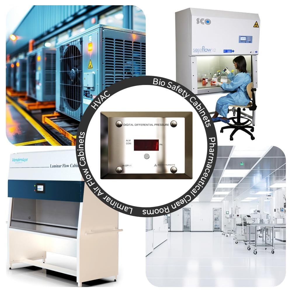 Supply Scope: 1 Unit of Differential Pressure Indicator, Power Adaptor, Instruction Manual and Factory Calibration Certificate | Applications: laminar air flow cabinets, clean rooms, Pharmaceuticals, Hospital OTs, biosafety cabinets, AHU.