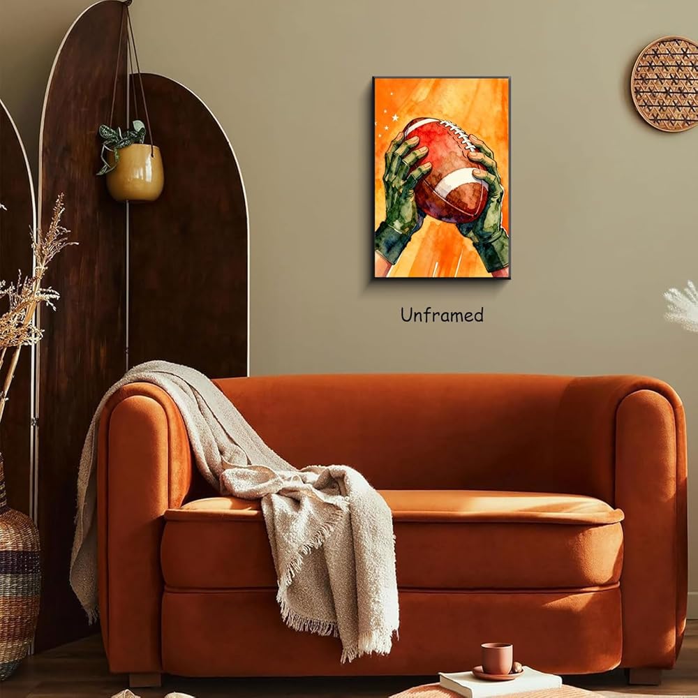 Elevate your sports-centric space with the artful, soulful charm of our American Football Watercolor Poster – a 16x24 inch unframed canvas print that wraps gridiron passion in soft, expressive watercolor art. This standout piece centers on a close-up of gloved hands cradling an American football: warm orange hues blend with delicate texture details and a dreamy watercolor wash, turning a iconic game-day moment into a work that feels both inspirational and visually soothing. Unlike bold, graphic sports decor, this poster leans into artistic elegance – balancing the raw energy of football with the gentle depth of watercolor. At 16x24 inches, the unframed design offers full flexibility: frame it to match your man cave's industrial vibe, mount with clips for a casual game room look, or layer it with memorabilia for a curated sports hub. Whether you're decking out your man cave with artful sports flair, adding heart to your game room, or gifting the football lover in your life, this poster merges artistic grace and gridiron spirit – turning any wall into a tribute to the sport's focus and passion.