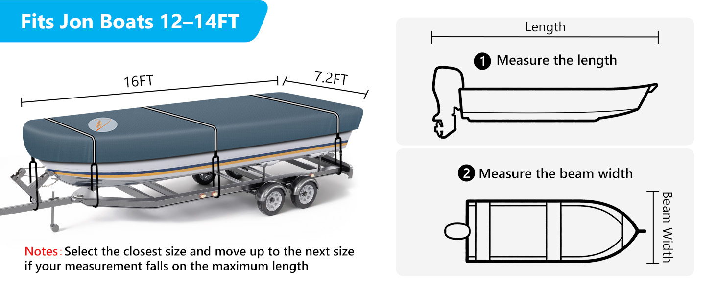 【Accurate Fit】 CEMOFE's jon boat cover fits jon boats 12–14 ft long with beam width up to 70'', offering a snug and reliable fit. Please measure your boat including accessories before purchase. If your boat falls between sizes, choosing the larger size ensures better coverage and reduces wind lift.