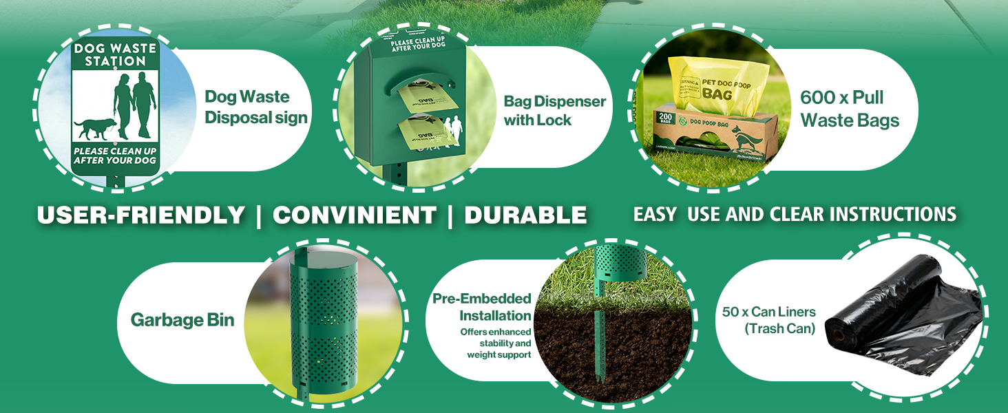Efficient Waste Management: The weather-proof locking dispenser designed for both roll bags and pull bags, providing easy access while storing more dog waste bags at once. This is complemented by a large-capacity dog poop trash can with a tight-sealing lid, ensuring a clean and odor-free environment.