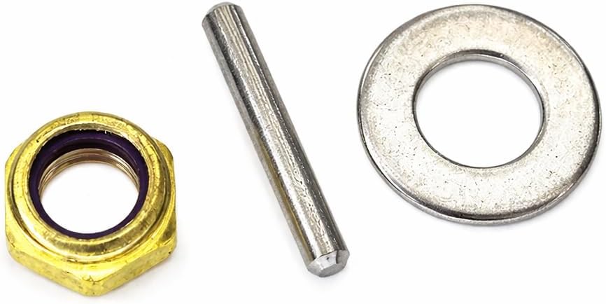 The kit includes a stainless steel shear pin, stainless prop washer, and brass prop nut. The shear pin is designed to protect the motor and drive components by breaking in the event of a prop strike, while the washer and nut provide secure prop retention.