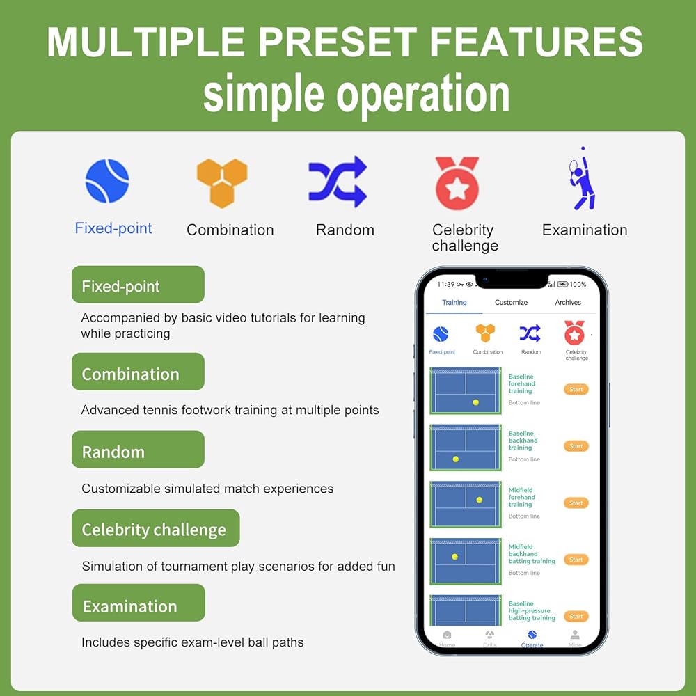 Advanced App Features: The accompanying app provides a range of training modes including slice serves, flat drives, topspin and backspin balls, fixed-point drills, combination drills, random modes, and even challenges based on famous tennis stars. You can also create custom drills and save an unlimited number of training programs.