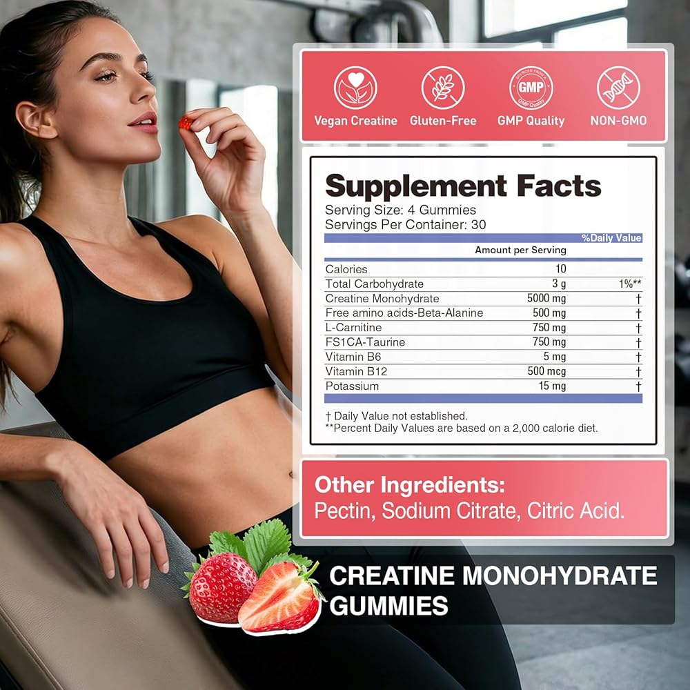 HIGH QUALITY CREATINE MONOHYDRATE GUMMIES:5 grams of high-quality creatine gummies, combined with L-taurine and vitamin B12, support muscle performance, reduce fatigue. Each gummy candy contains pure creatine monohydrate, which can quickly increase muscle cell energy reserves, promote protein synthesis, help male and female fitness enthusiasts break through training bottlenecks, and accelerate muscle building effects.
