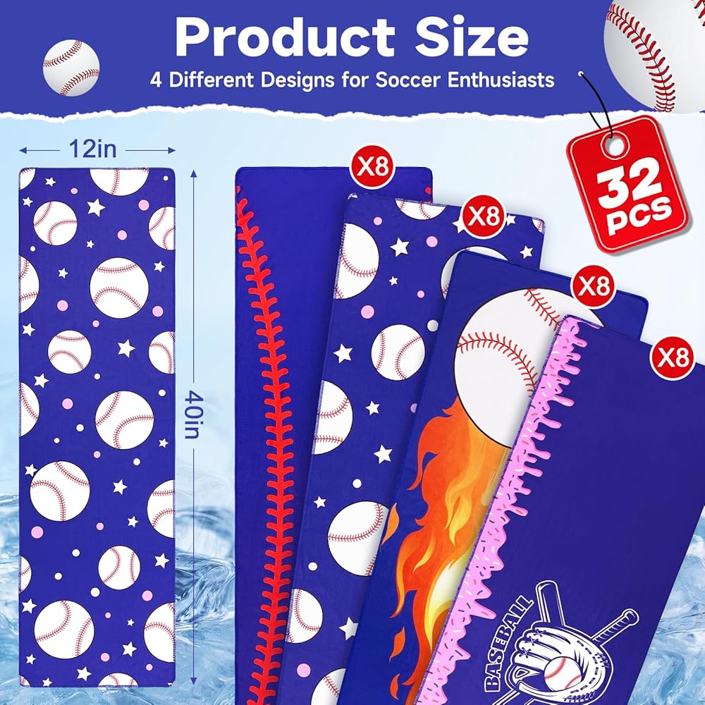 【Ultimate 32-Pack: The Perfect Team Gift】 Package includes 32 individual cooling towels in 4 vibrant colors and unique baseball-themed designs (8 towels per style). It's the ultimate value pack for baseball teams, coaches, and sports organizations. Ideal for tournament giveaways, end-of-season gifts, or keeping the whole dugout cool during intense summer practice sessions.