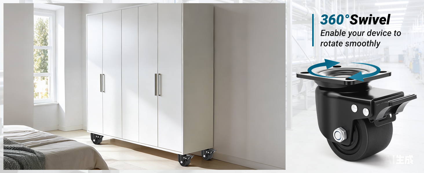 【Wide Application】Our corrosion-resistant heavy duty caster wheels are suitable for industrial and furniture applications, like workbenches, trolley, cabinets, bookshelves, equipment, furniture and so on.