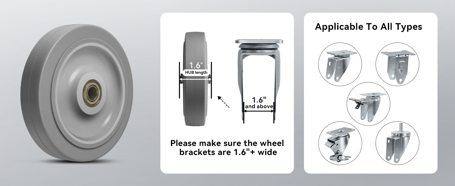 Caster Wheel Diameter : 3"/3.5"/4"/5", Wheel Tread Width: 1.25". Axle Bore: 3/8", Hub Length: 1.6". Rubber Wheels can withstand most chemicals, solvents, acids and oils, giving you a perfect experience.