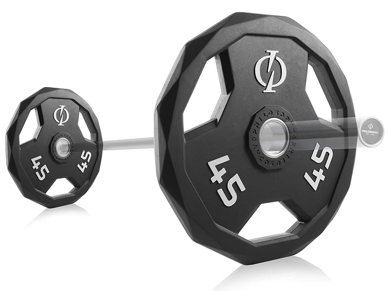 Universal Olympic weight plate: Rubber coated weight plates from Philosophy Gym are made for heavy-duty use with barbells. Perfect for home use, these weights can be stacked to meet your desired level of lifting weight.