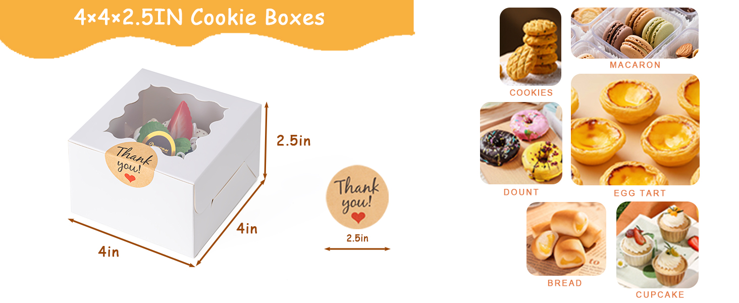 Cookie Box Size: 4x4x2.5 inches, can be used as a bakery, treat, christmas cookie, chocolate, dessert, pastry, macaron, muffin, donut box. You can add your favorite decorations and DIY your own style of box to make your gift more unique. Your family or customers will definitely love these cute boxes!