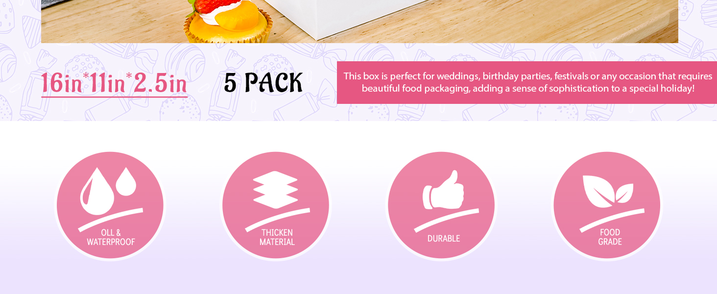 Professional Size: Each cookie cake box measures 16 x 11 x 2.5 inches, with a 5-pack set included. It's perfect for packaging cookies, small cakes, chocolate strawberries, chocolate hearts, and other desserts, catering to both professional bakers and home baking enthusiasts