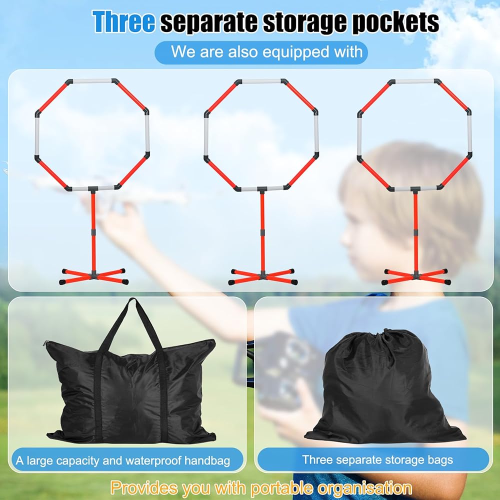 Quick Setup & Easy Storage: Assembles full course in under 5 minutes. Includes user directions for error-free configuration. And we provide 1 big storage bag, plus 3 Separate Storage Bag for each kit, giving you easy organization and portability for easy transport to parks, events, or drone meetups