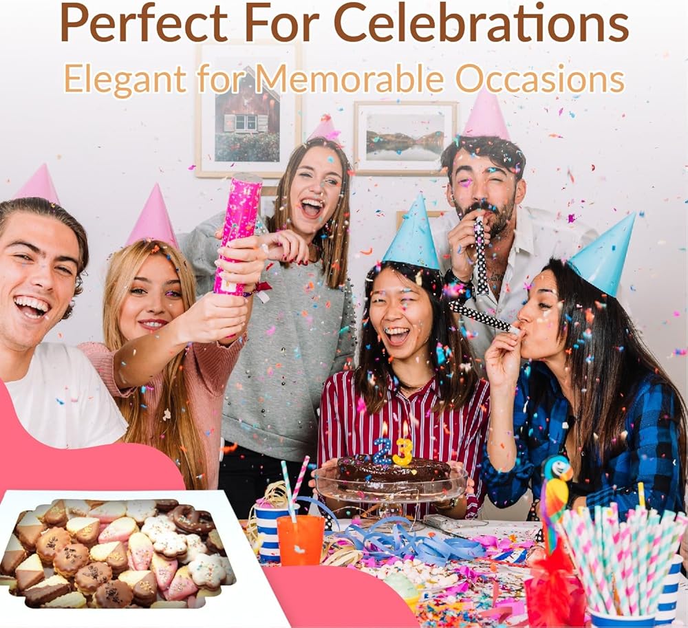 Multiple Uses: Our square cookie boxes 10x10x2.5 are versatile and can be used for various treats, such as chocolate-covered strawberries, pies, muffins, and small cakes, making them perfect for friend gatherings, birthday parties, or business use.