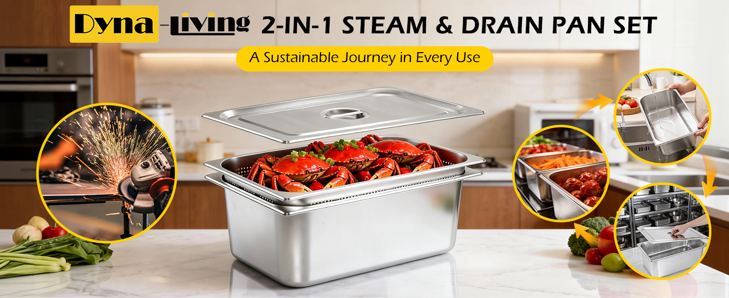 COMMERCIAL HOTEL PAN SET: Ideal for steaming, boiling, baking, storing, and serving. Set includes 1 x 8" deep steam table pan, 1 x 6" deep perforated pan, 1 x universal stainless steel lid, designed for buffet catering, restaurant supplies, and high-volume cooking. Use metal pans together for bain-marie serving, or separately for prepping, steaming and storing, maximizing efficiency in any commercial or home kitchen