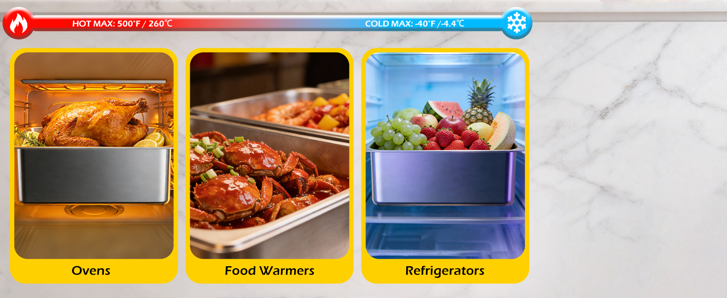 VERSATILE USAGE: This stainless steel pans are suitable for both hot and cold use, compatible with oven and refrigerator environments. Fully meeting diverse needs in home kitchens, busy restaurants, buffet, cafeterias, hotels, ice cream shops, and more. Even can be applied for pet cat litter trays, offering extensive versatility