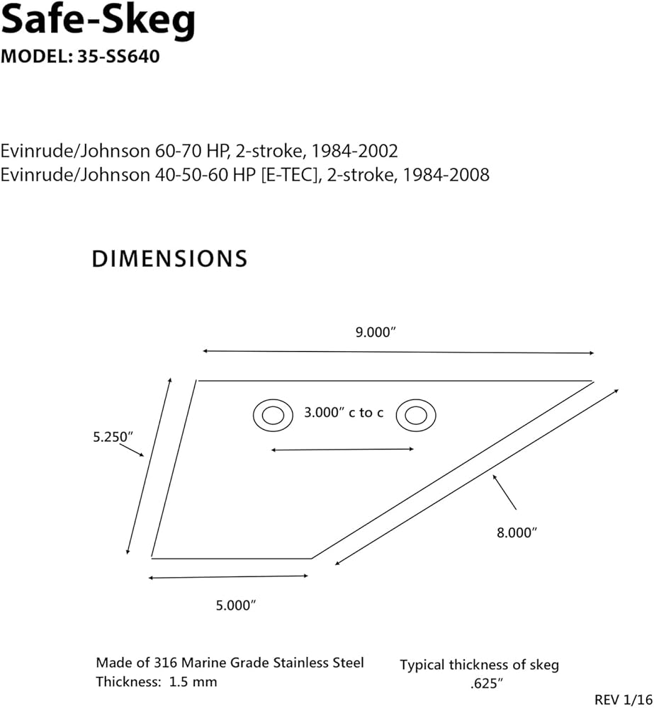 The Ultimate Stainless Steel Skeg Protection! Whether you're looking to protect your new skeg, repair your damaged one, or just add some shine, the 316 marine-grade stainless steel construction Safe-Skeg is brilliantly polished and ready to install. Kits Include: Mounting hardware, instructions, Allen wrench and Loctite 262.