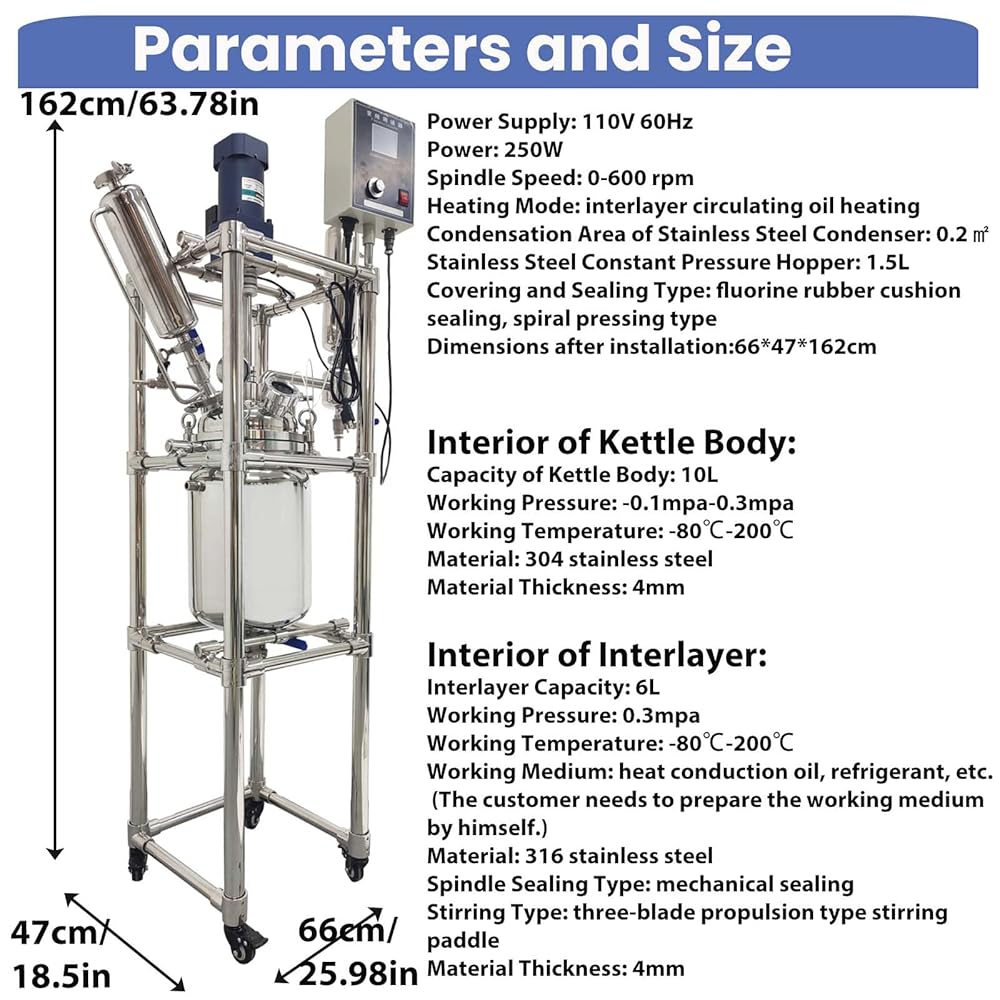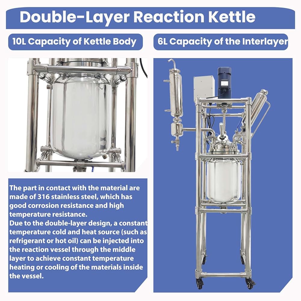 110V Double-Layer Jacketed Glass Reactor Reaction Kettle 10L Chemical Lab Vessel Device for Reaction Distillation with Stainless Steel Support Frame and Wheels Adjustable Speed 0-600RPM