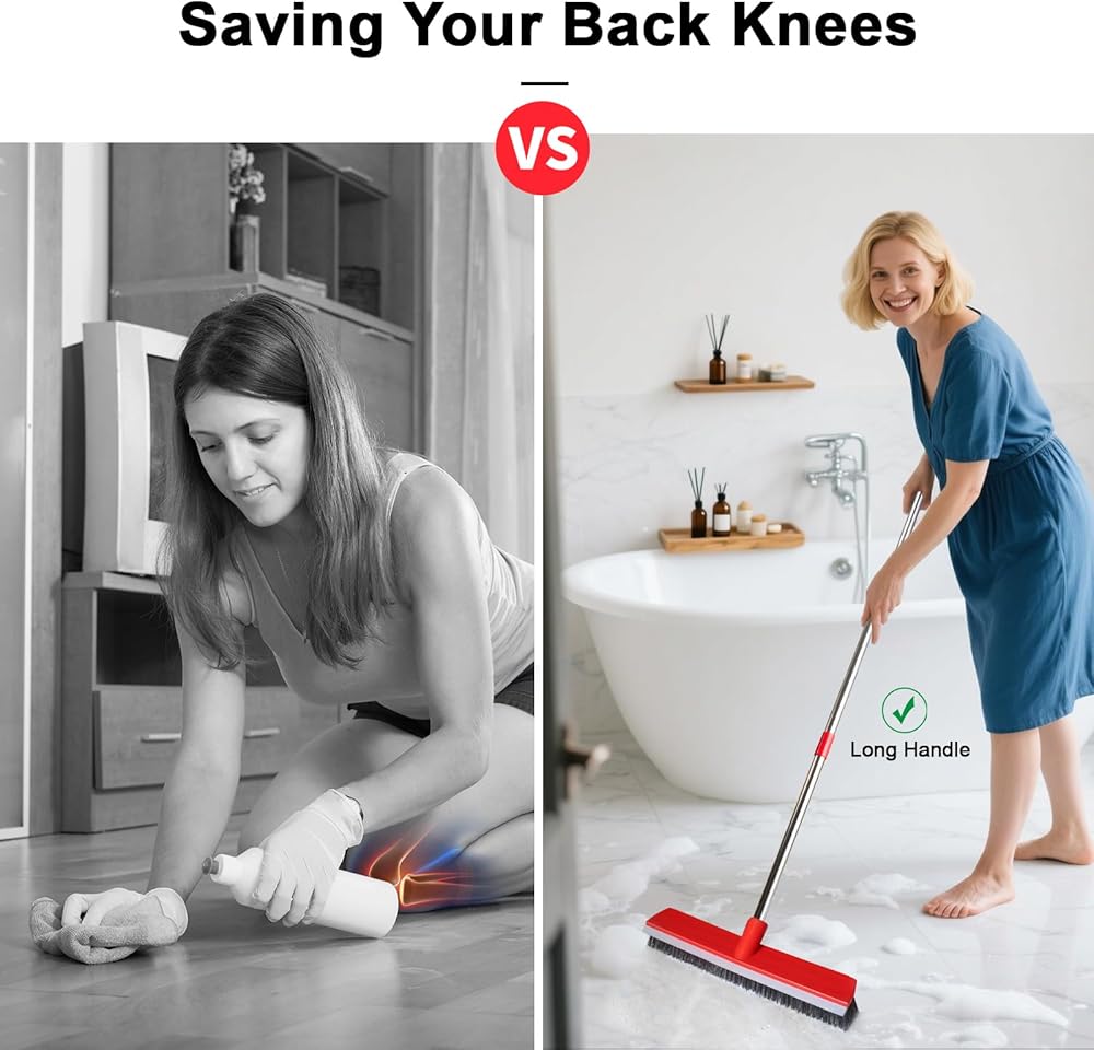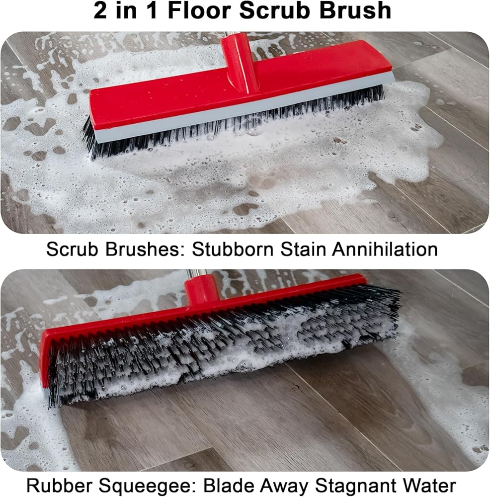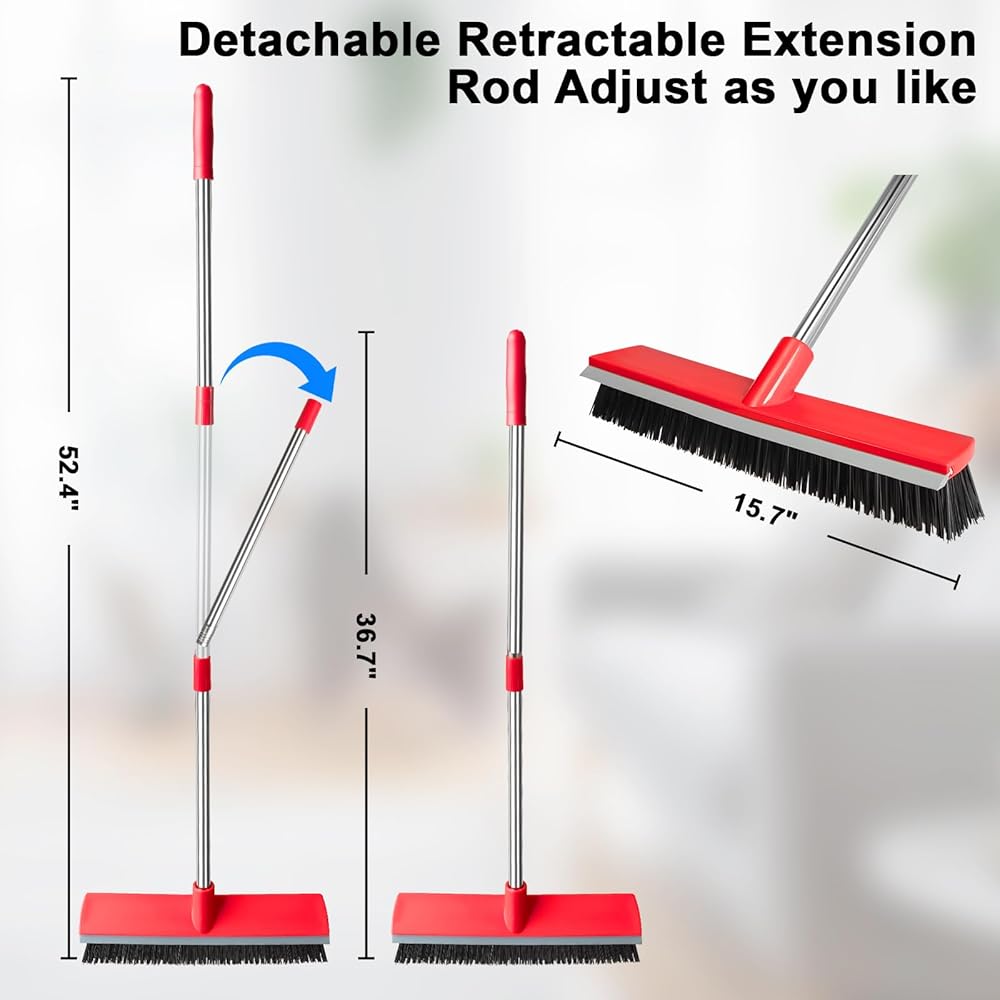 【Sturdy Long Handle】: Floor Scrub Brush 15.7 inch Wide: The Stainless steel pole length can be adjusted from 36.7 inches to 52.4 inches, if you use two poles, the length is 36.7 inch, and if three poles, 52.4 inch, so you don't need to bend your back.