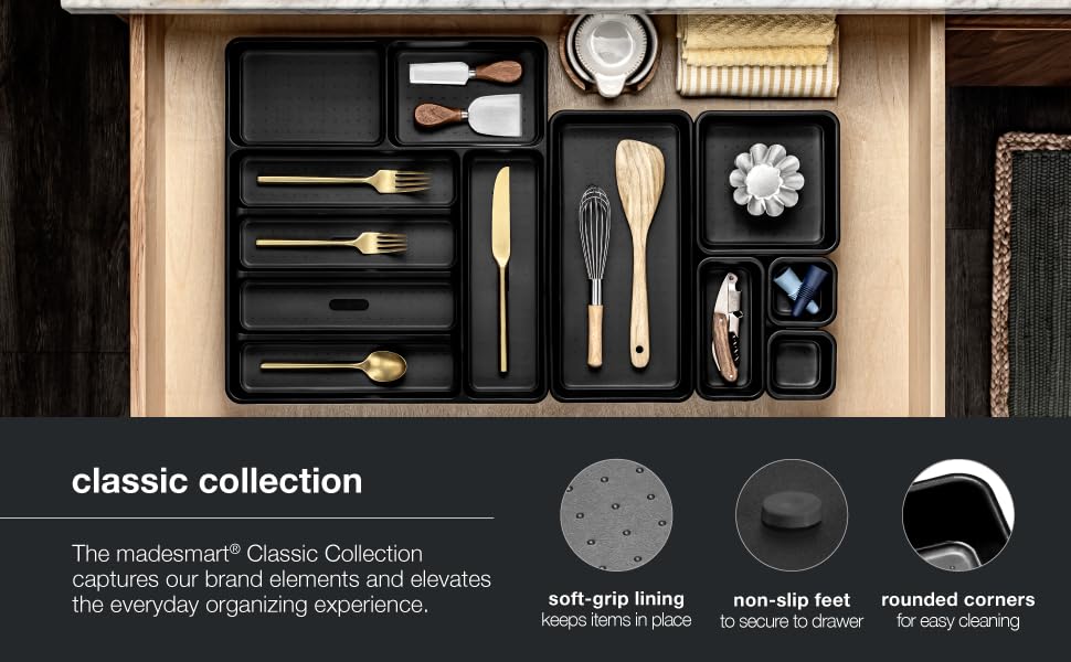 Keep your knives sharp, safe, and organized with the madesmart® Antimicrobial Large Classic In-Drawer Knife Mat. This superior drawer organizer features 11 spaces, each properly sized to accommodate the blades of your kitchen knives. The high-grade design is complete with a non-slip, soft-grip lined base that prevents your knives from sliding in your kitchen drawer. Crafted with nothing but the best, this premium storage solution is made from top-quality, BPA-free plastic that is infused with an EPA certified antimicrobial additive to resist growth that causes stains or odors.