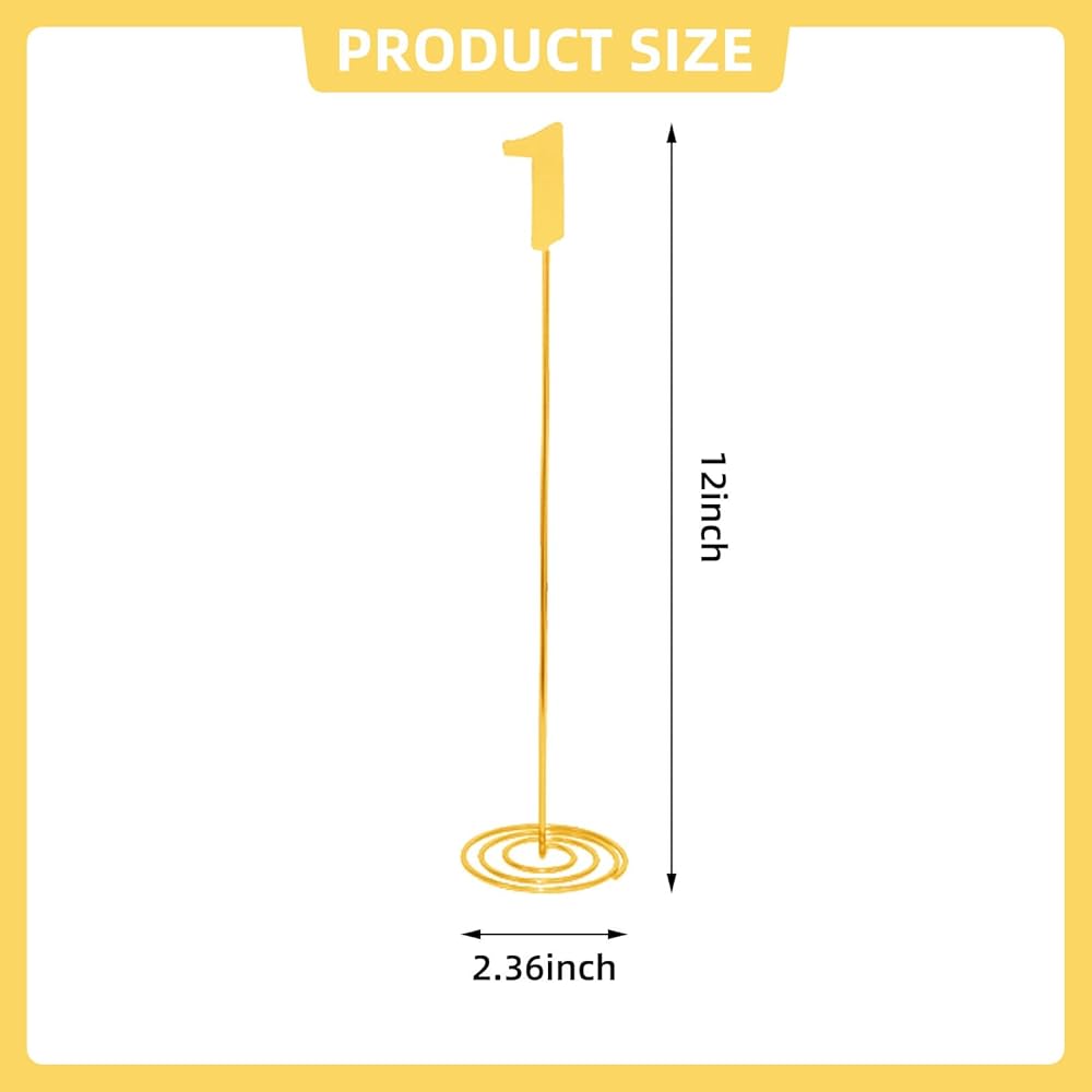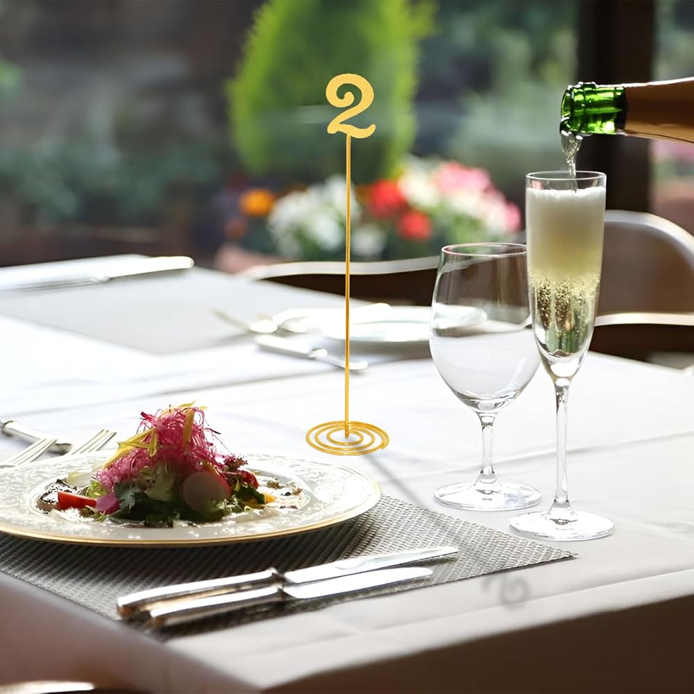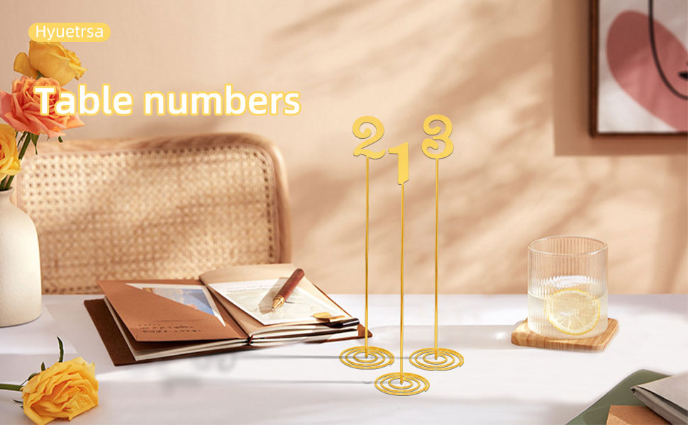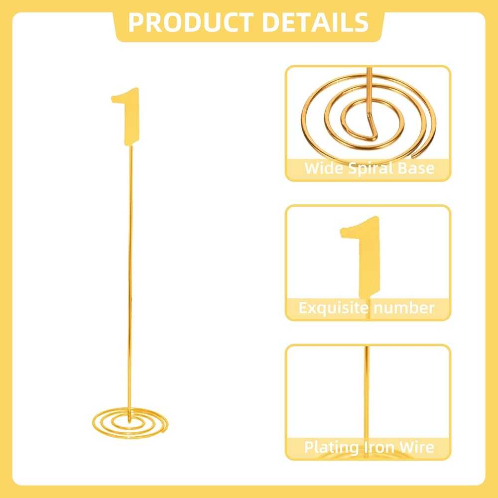 Premium Material: The table number signs is made of metal, which is sturdy and durable. The surface is golden, presenting a metallic luster. The structure is lightweight and stable, making it easy to take out and place