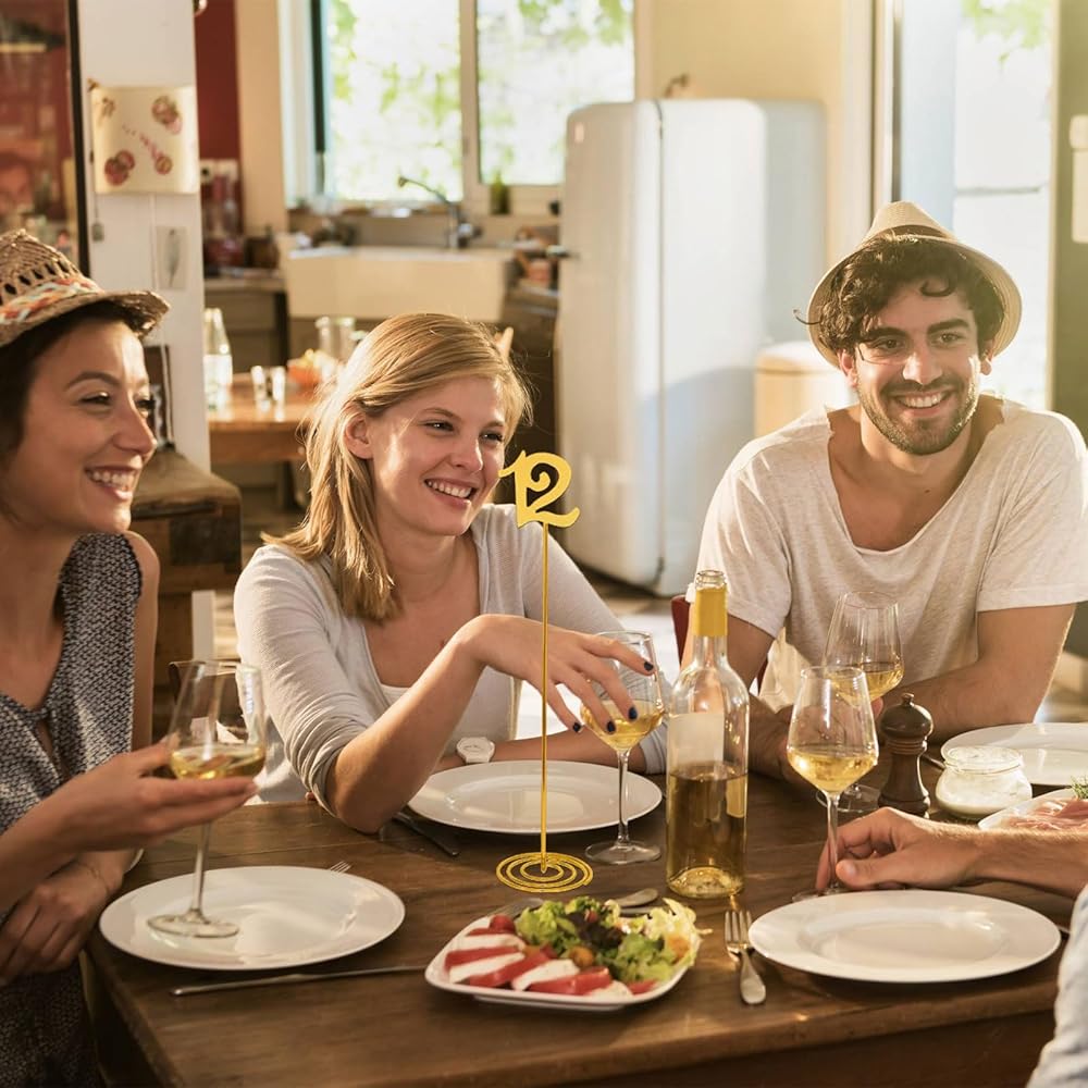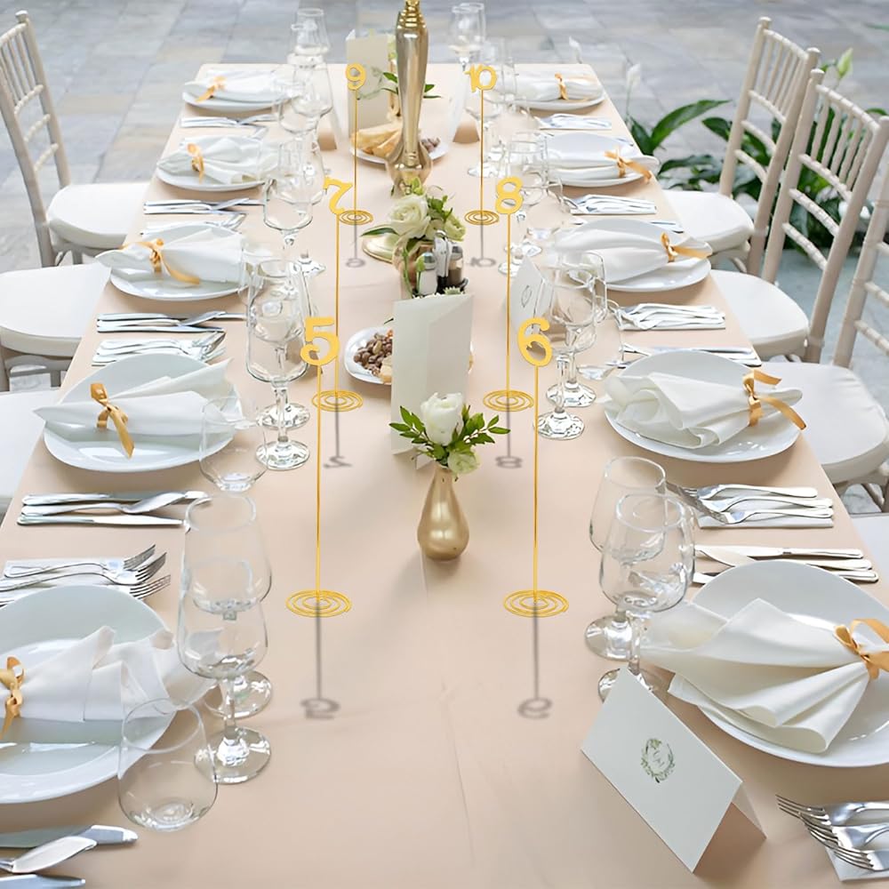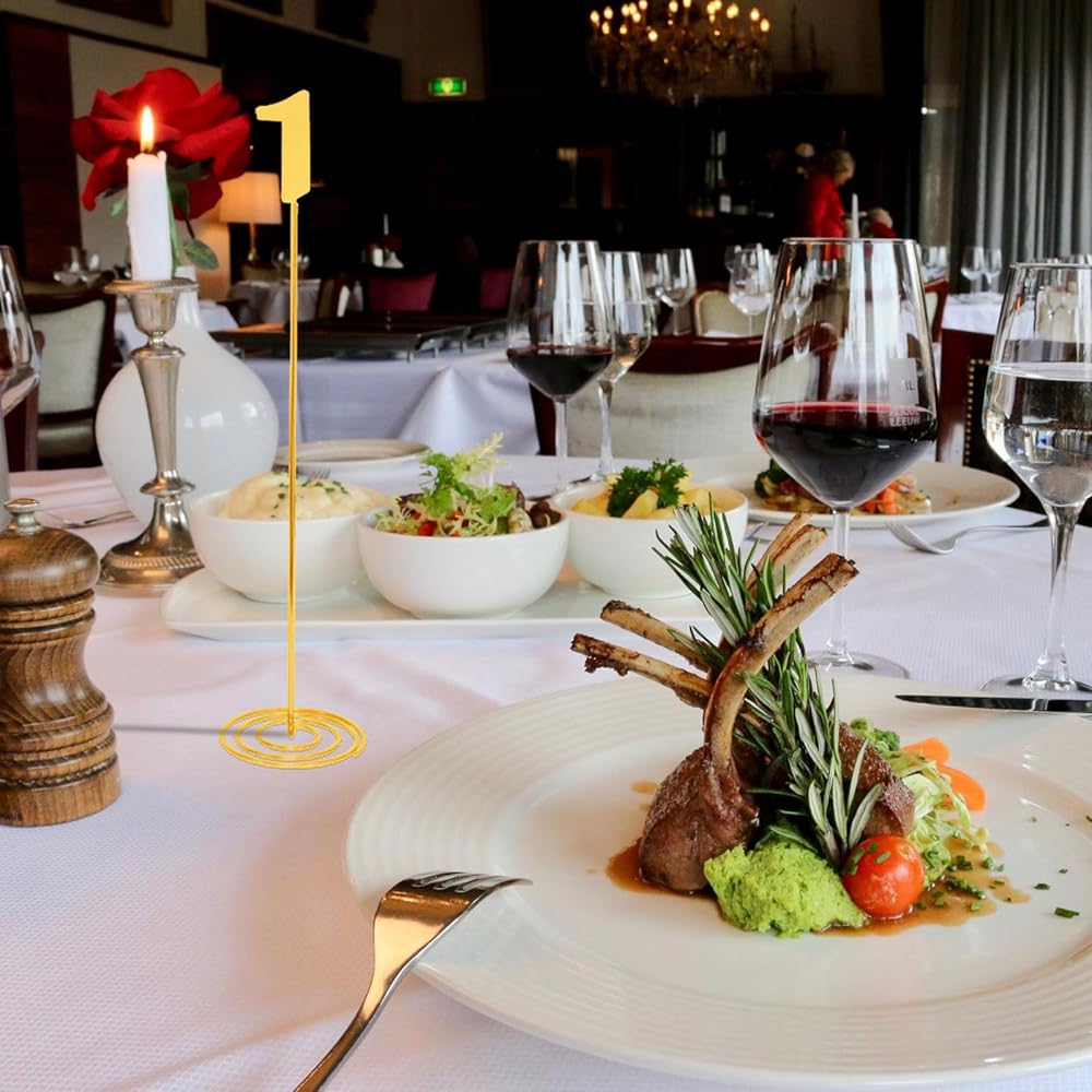 Premium Material: The table number signs is made of metal, which is sturdy and durable. The surface is golden, presenting a metallic luster. The structure is lightweight and stable, making it easy to take out and place