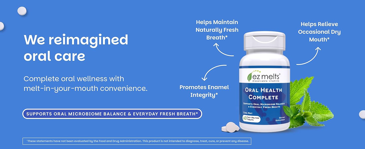 Oral Care Tablets: EZ Melts Dissolvable Oral Health Complete is formulated to dissolve quickly in your mouth, so keeping up with your oral hygiene is easy and convenient