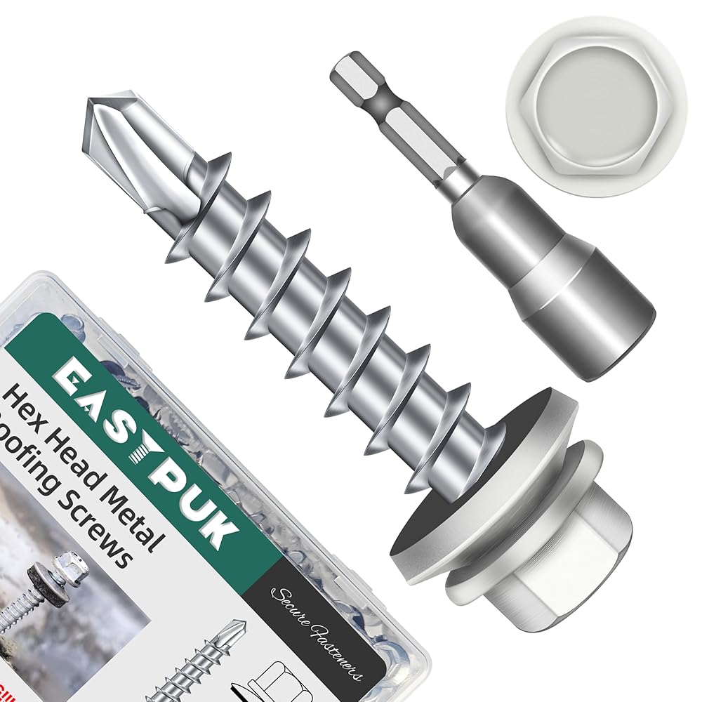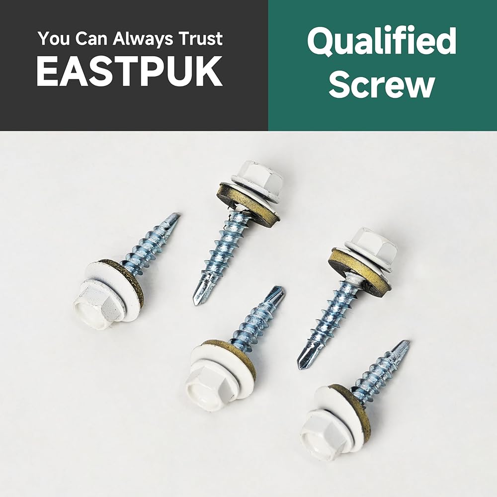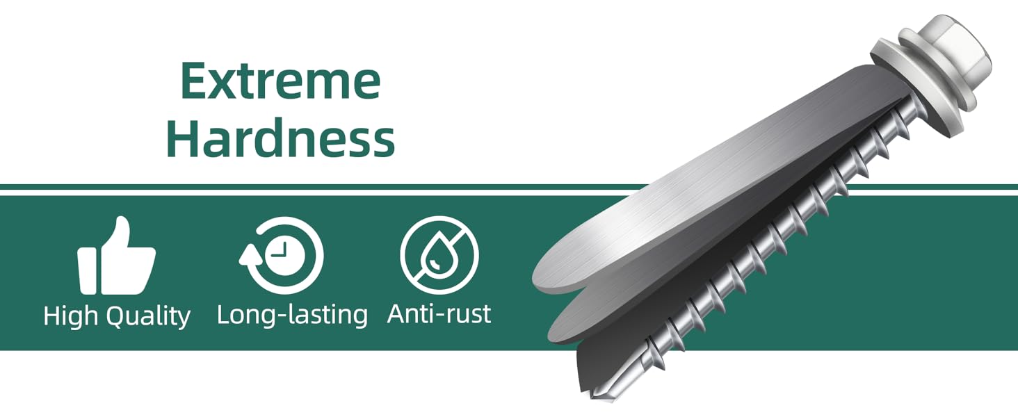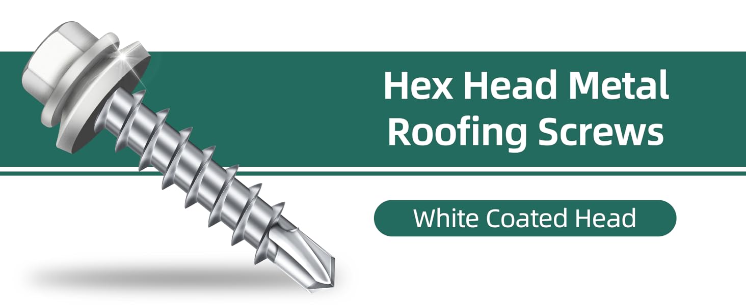 Material - Hex head metal roofing screws are made from mechanically galvanized steel, withstand 1500 hours of salt spray testing for enhanced hardness and corrosion resistance, feature a baked-on paint coating on the head to match common roof panel colors and improve weather resistance.