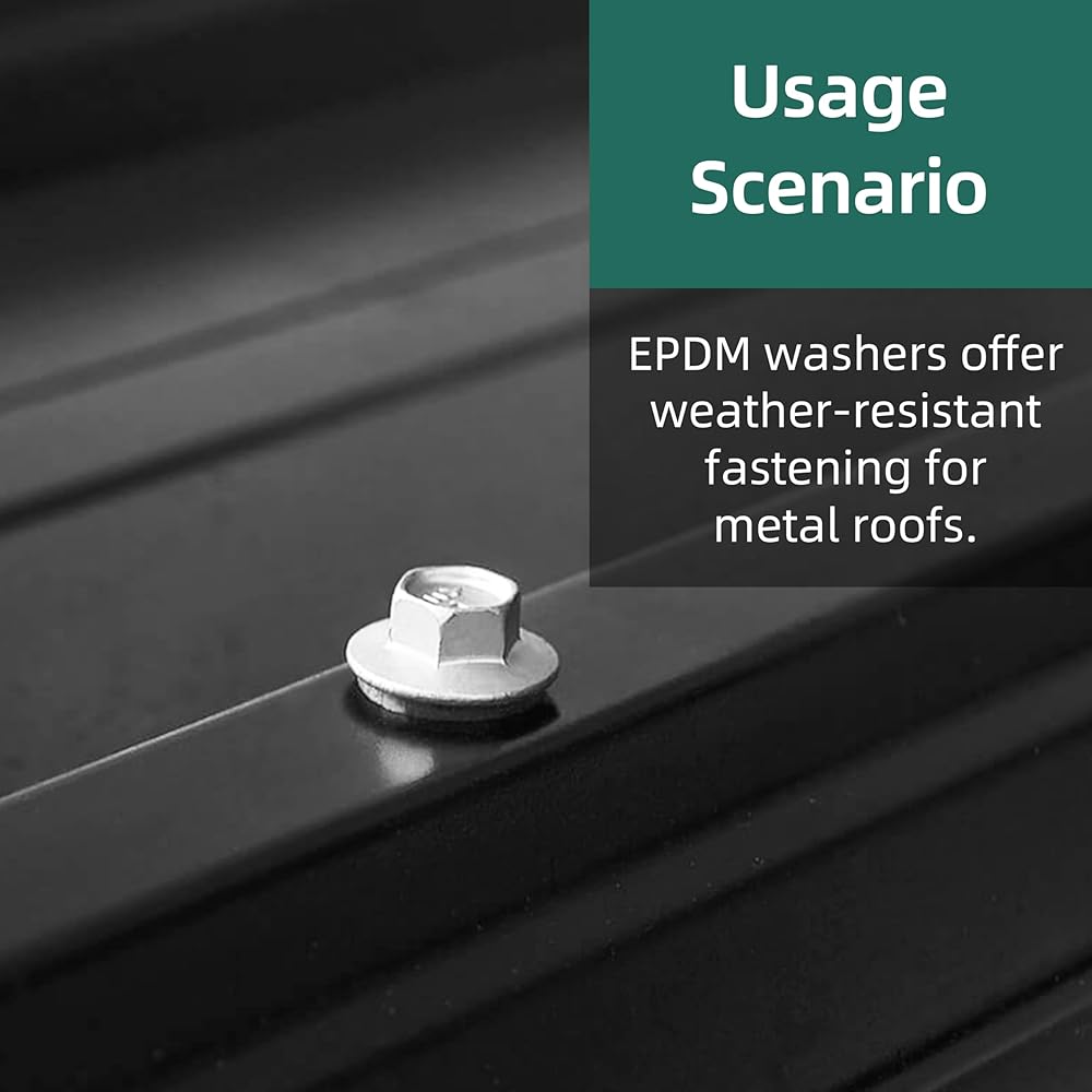 EPDM Rubber Washer - Roofing screws with rubber washer. Each metal roofing screw includes a 1/2 inch EPDM rubber washer reinforced with a metal backing. The washer is designed to compress under fastening pressure to help form a weather-resistant seal and maintain performance under temperature variations and outdoor exposure.