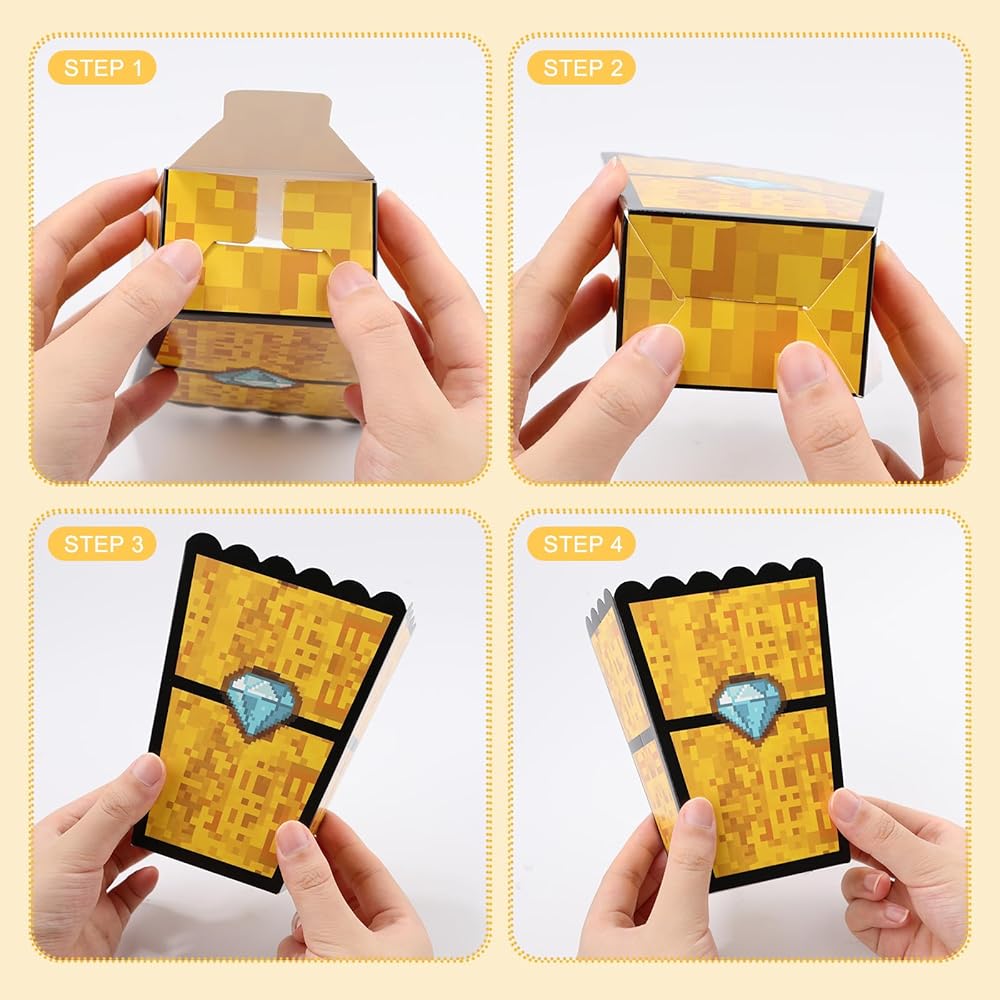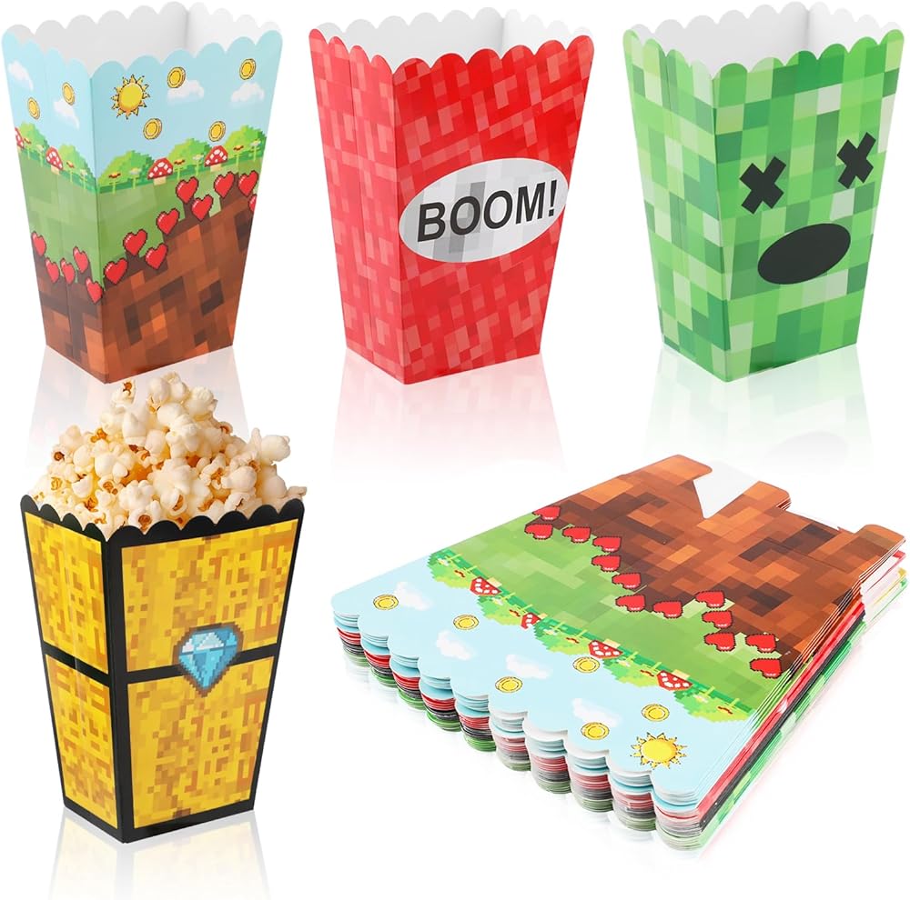 Product Packaging: You will receive 24 pieces 4 styles of pixel-style popcorn boxes in the package, measuring about 13x6.3x4.5cm/5.12x2.48x1.77in. This sufficient quantity and capacity ensure you have enough boxes to serve plenty of popcorn to your guests at any event, making them ideal for large gatherings or parties. Premium Material: Made from high-quality card stock, these popcorn boxes are thick, smooth, and odor-free. They are easy to fold and durable, not easy to break or damage, so you can use them with confidence for your snacks without any concerns about safety or reliability. Multiple Uses: These versatile popcorn boxes are perfect for various occasions like birthday parties, movie nights, game parties, picnics, and weddings. They can easily hold popcorn, snacks, candies, cookies, and other small desserts, adding a fun and practical element to your gatherings and events. Pixel Theme: Featuring a creative pixel-art design with vibrant colors, these popcorn boxes bring a retro gaming experience to your parties. The foldable design makes them convenient to store and use, enhancing the theme of your event while providing an authentic and engaging atmosphere for all guests. Simple Setup: Our popcorn boxes are easy to assemble by folding along the creases and pressing the bottom to lock. With no complicated steps, you can quickly set them up, fill with popcorn, and enjoy your snack without hassle, making them a convenient choice for busy hosts or spontaneous events.
