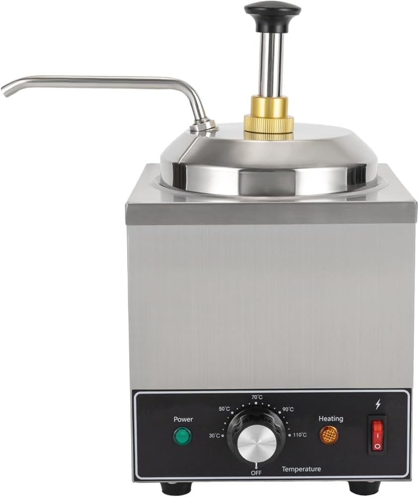 Hot topping warmer and dispenser heats and maintains the temperature of various seasonings and soups and is ideal for melting chocolate, butter, cheese, caramel, butter topping, curry, chili, fudge, and more. This hot fudge warmer with pump is widely used in homes, cafeterias, fast food restaurants, snack bars, ice cream parlors, cafeterias, etc.