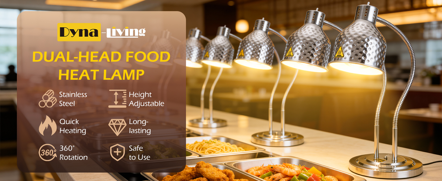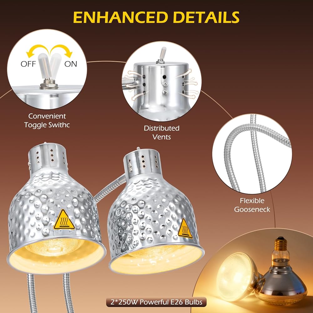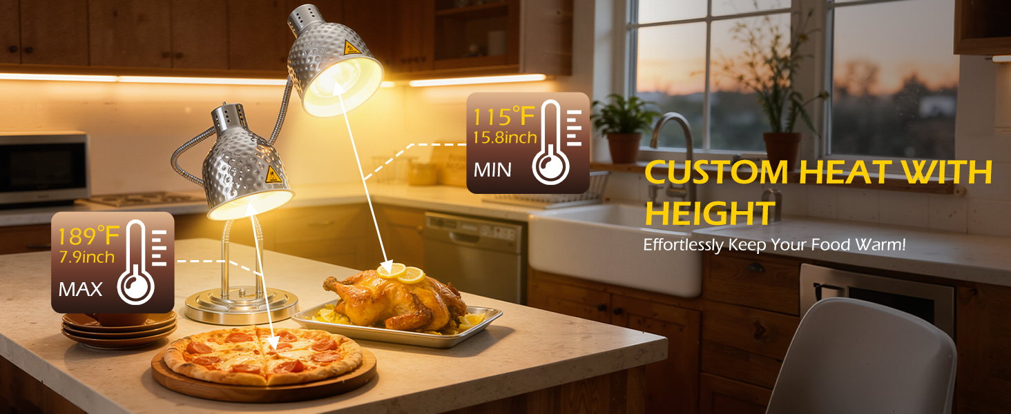 DOUBLE 250W HEATING – Our food heat lamp equipped with 2 ETL high-quality 250W bulbs (500W total) that reach up to 185°F/85°C. Consistent heat to keep your dishes at the perfect serving temperature for hours, perfect for keeping meals warm during peak hours, enhancing the customer dining experience