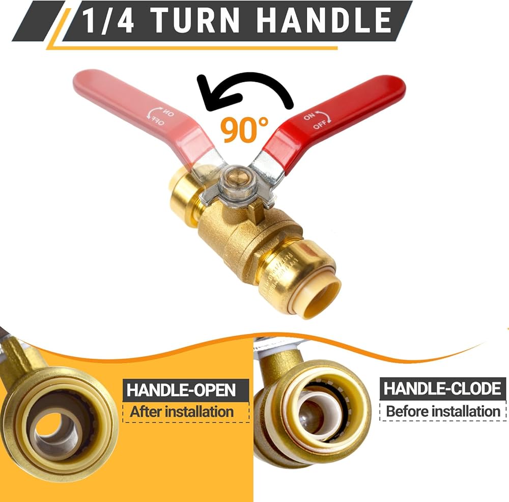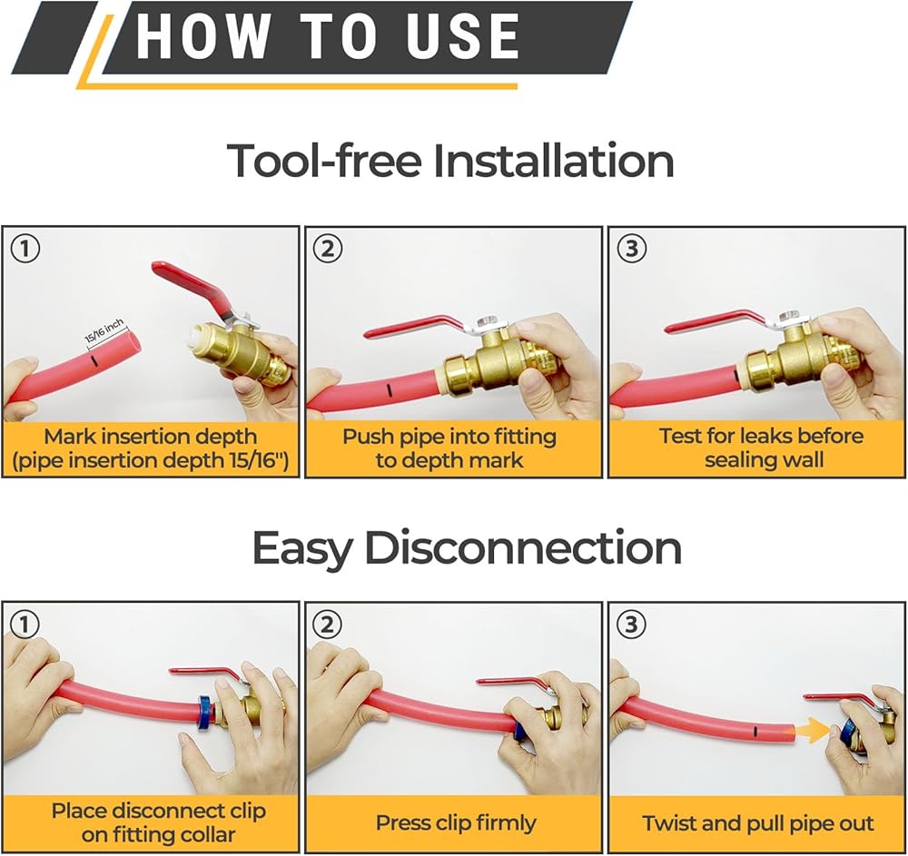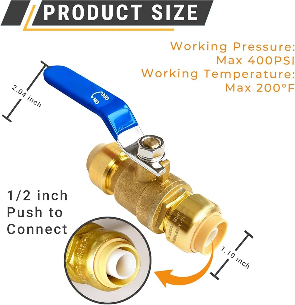 【Tool-Free Push-Fit Installation】Install faster than soldering or crimping! Simply insert PEX, copper, or CPVC pipes into these 1/2 inch push to connect valves for instant secure connections. Includes disconnect clips for effortless removal/repositioning, zero glue, tools, or threading required, so it is perfect for tight spaces.