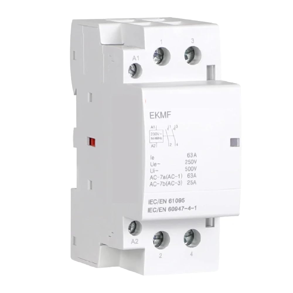 The EKMF Modular Contactor is a versatile electrical component designed for both industrial and residential applications. This DIN rail-mounted contactor offers exceptional flexibility with its modular design, available in both 2-pole and 4-pole configurations to accommodate various installation requirements. Operating seamlessly with single-phase 230V and three-phase 380V systems, it provides reliable automatic switching control for your electrical circuits. The contactor features robust terminal connections and clear marking for easy wiring and maintenance. Its compact form factor makes it ideal for integration into electrical panels while maintaining high performance standards. The device complies with relevant electrical standards and offers dependable operation for both light commercial and heavy industrial applications. Perfect for motor control, lighting systems, and power distribution, this contactor combines practical functionality with professional-grade construction. The thoughtful design includes status indication and secure mounting features, making it a reliable choice for electrical system designers and installers.