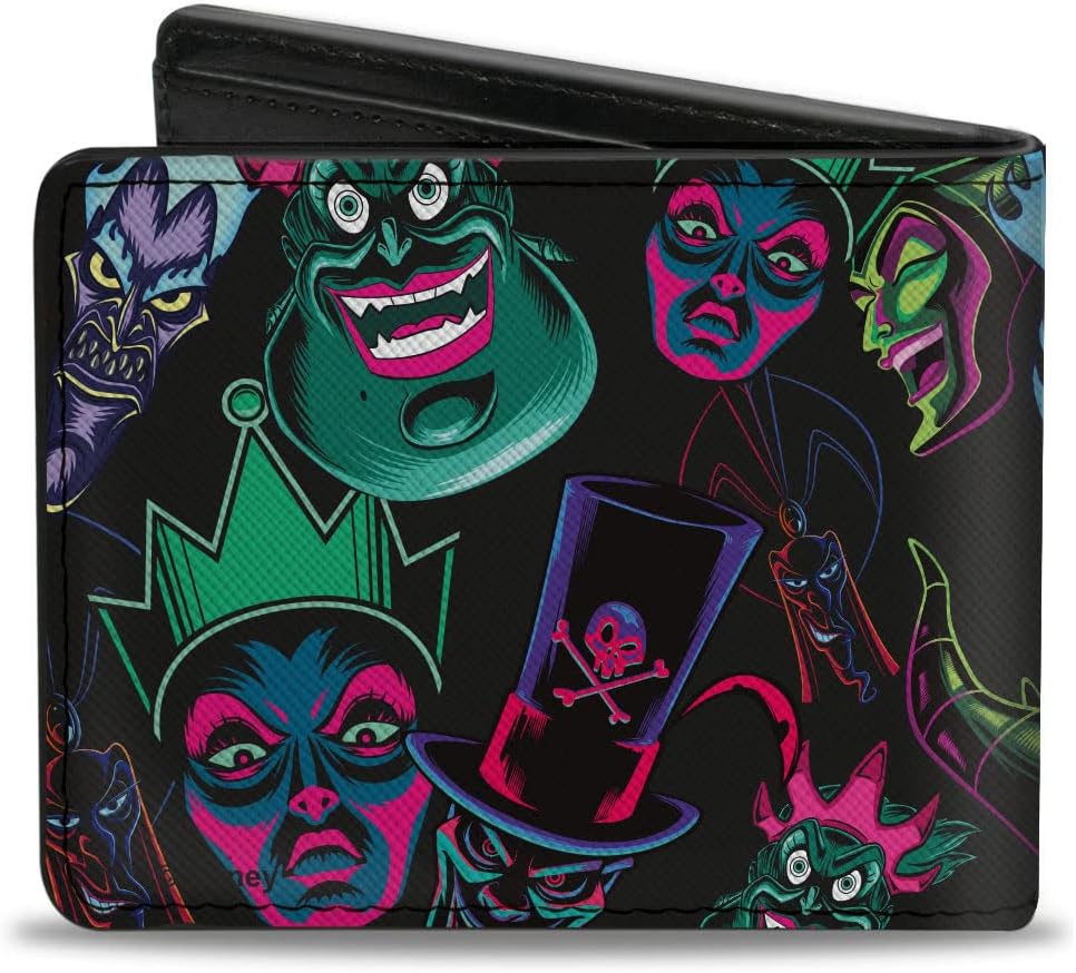 محفظة رجالية مشبكة للأسفل، ثنائية الطي، مجموعة وجوه ديزني الشريرة، أسود متعدد نيون، جلد نباتي، 4.0 بوصة × 3.5 بوصة
