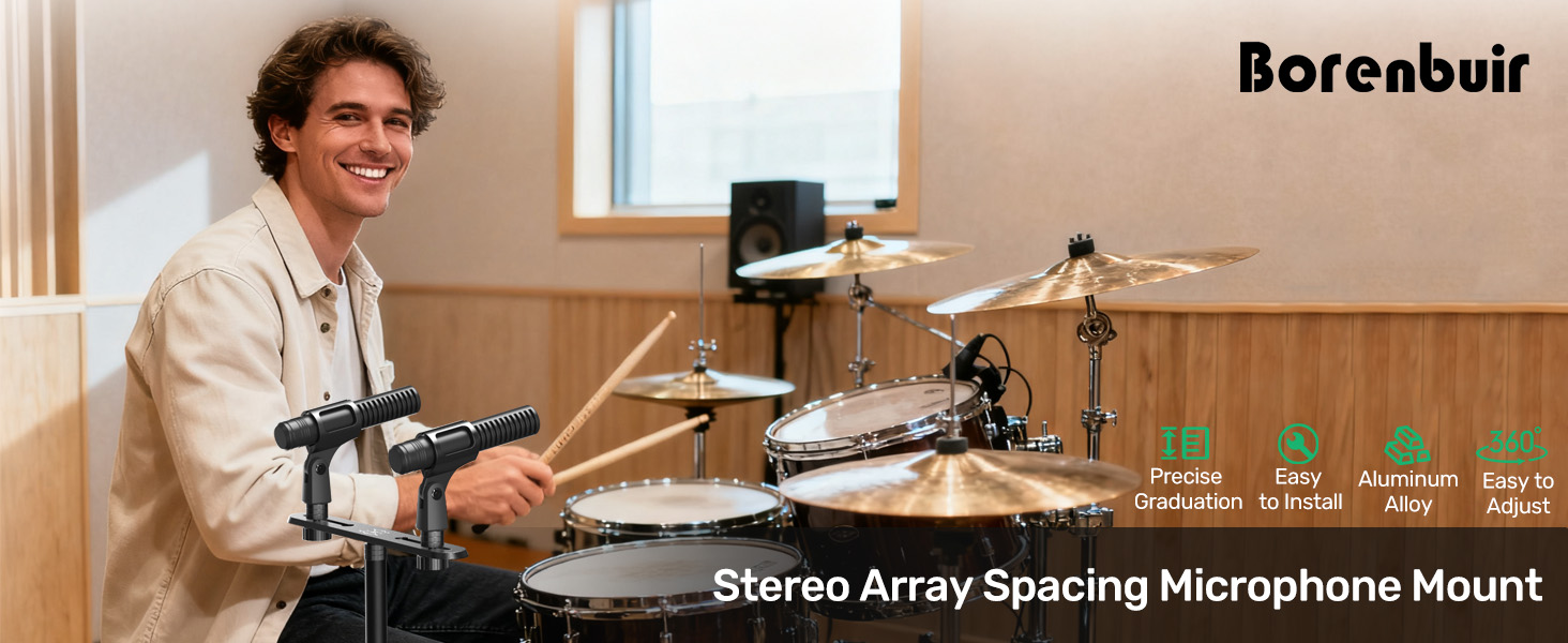 【Dual 360° Angle-Adjustable Microphone Clips】 Features two premium microphone clips (25 mm diameter) with 360° rotation and tilt angle locking. Enables vertical, inverted, or angled microphone mounting, compatible with ORTF, XY, NOS, and other array or stacked configurations. Perfect for drum suspension mics, piano recording, press conferences, and similar scenarios.