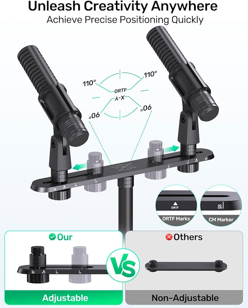 【Professional Spacing Markers】 Features industry-leading 7.87" (20 cm) clear spacing markers for precise stereo positioning. Achieve professional microphone placement in just 2 minutes, effortlessly setting up XY/ORTF/NOS arrays. Eliminate guesswork and consistently control microphone spacing for immersive stereo recordings. The entire process requires just three steps: slide, align, and lock. Compatible with popular microphones including Rode NT5, Shure SM58, and Audio-Technica AT2020.