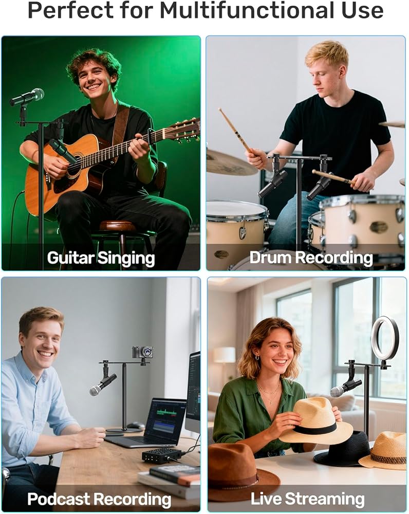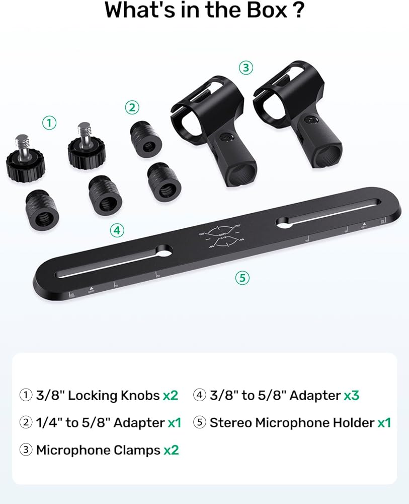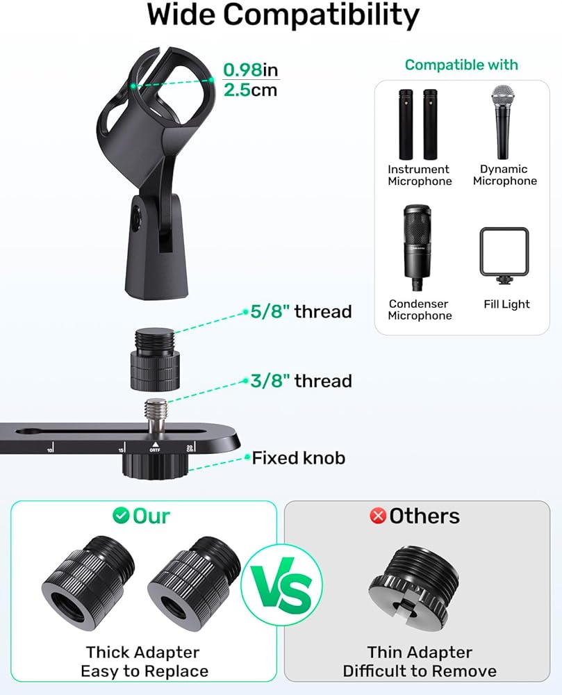 【Universal Compatibility】 This stereo microphone boom features a standard 5/8" threaded mount at its base, seamlessly compatible with 99% of microphone stands, boom arms, and tripods on the market. Included are 3 metal thread adapters (3/8" to 5/8") and 1 metal thread adapter (1/4" to 5/8"). No additional purchases are needed—this all-in-one solution eliminates compatibility concerns entirely.