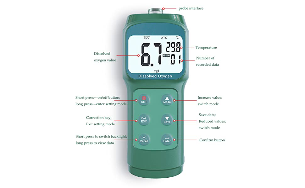 Portable Dissolved Oxygen Meter Optical Dissolved Oxygen Meter with Solution 0.1 (mg/L) Dissolved Oxygen Measurement Range 0~15mg/L or 0~119.9% 5m Probe Altitude Compensation 0~1000m