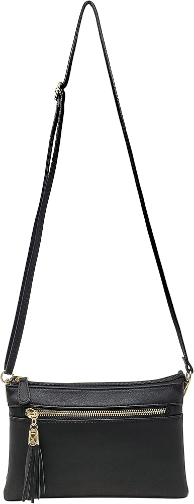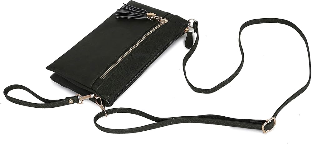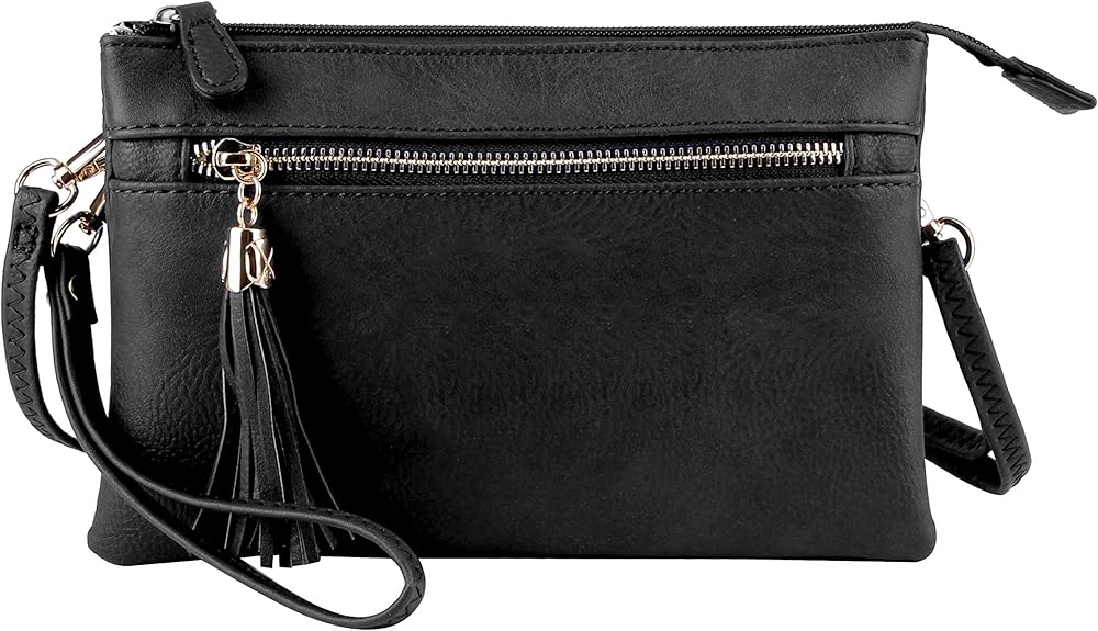 This multi-compartment wristlet clutch has 3 main compartments and a detachable Wristlet. It has a top zipper closure, 1 zipper pocket with tassels on the front, and an inner open pocket. The shoulder strap drops up to 27"