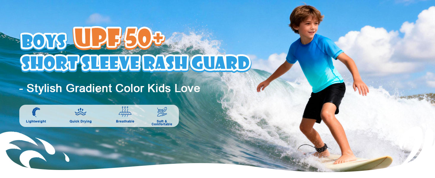 Vibrant Gradient Color Design: This boys gradient short sleeve rash guard features a bright, eye-catching gradient color design that looks stylish and fun, making kids stand out at the beach, pool, or playground