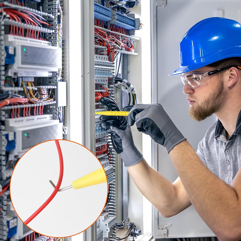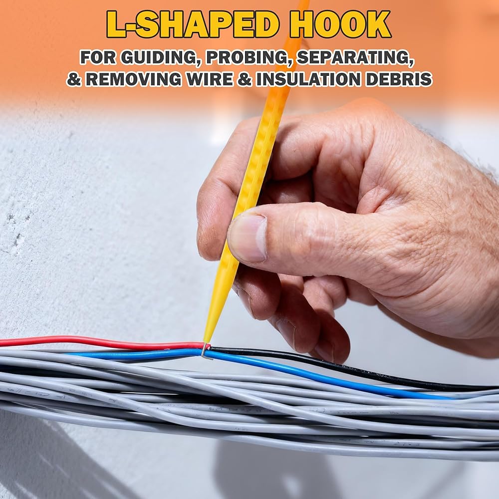 Flat Head Design: Opposite the L-shaped hook, the tool features a flat head with two small indentations. This design provides a secure grip for handling wires and electrical contacts with precision