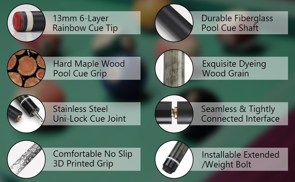【Premium Material for Upgraded Performance】 The pool cue is made of multiple layers of high-strength glass fibers, paired with hard Canadian maple wood pool cue butt, it has excellent resistance to bending and warping, as well as durability and maneuverability.