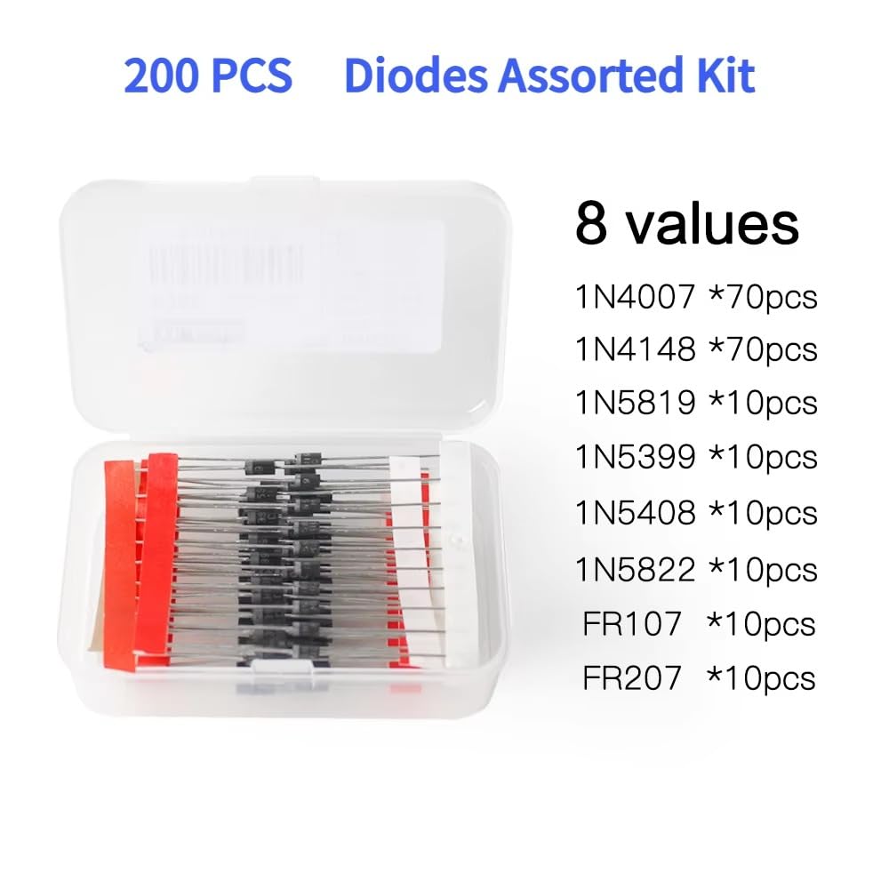 • ✔ Package List: 200PCS*Rectifier Diode Assorted kit . Have 8 values. High voltage rectifier diode: 70pcs * 1N4007.10pcs * 1N5408.Fast switching diode:70pcs * 1N4148.High current rectifier diode:10pcs * 1N5399.Schottky diode:10pcs * 1N5819.10pcs * 1N5822.Fast recovery diode:10pcs * FR107.10pcs * FR207