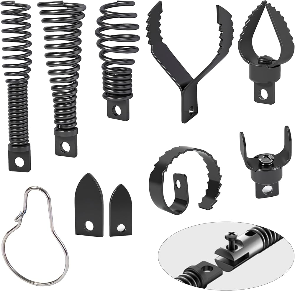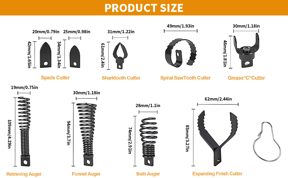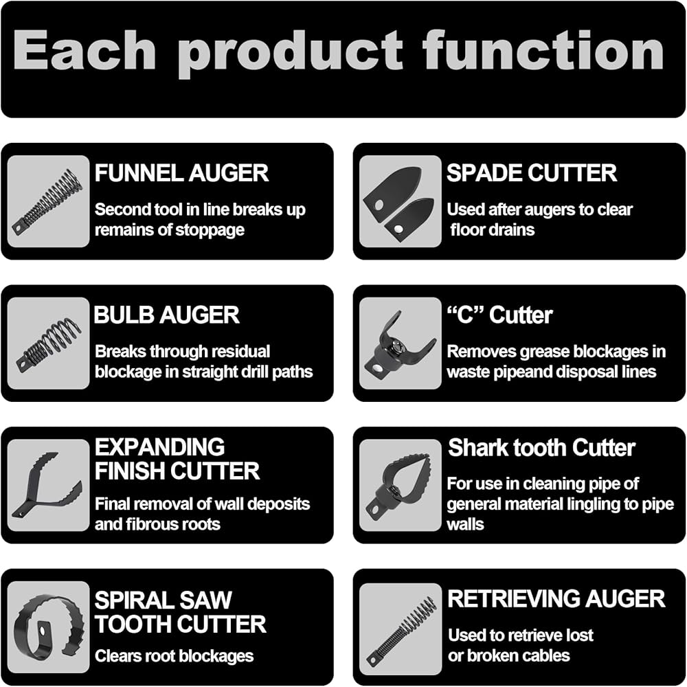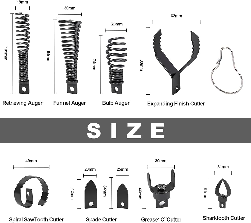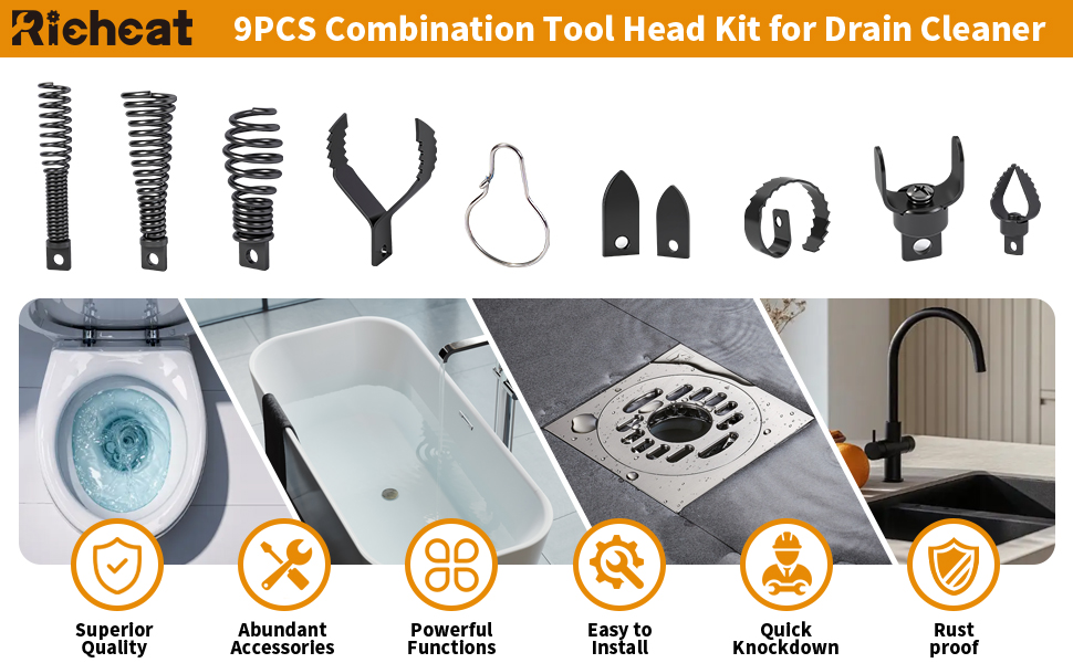 A variety of efficient unclogging options: Our Richcat drain snake drill attachment kit includes a variety of specialized cutter heads, including funnel,bulb,retrieving auger,expanding finish cutter,spiral saw tooth,spade,C,shark tooth cutter,Designed to clear a wide variety of stubborn clogs.