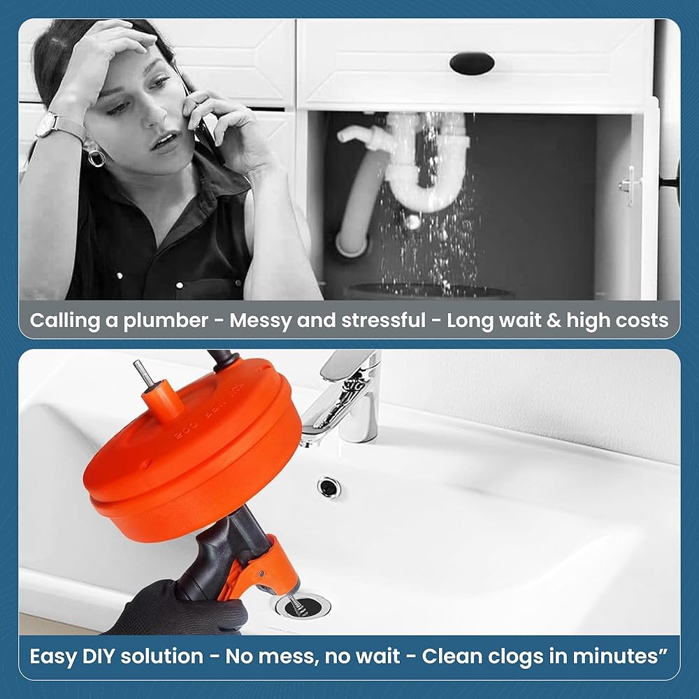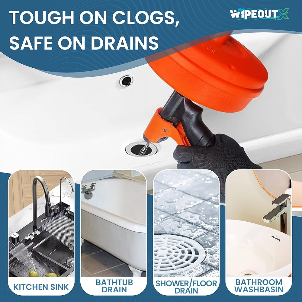 The WIPEOUTX 50ft drain auger and drain snake kit is the ultimate solution for tough drain blockages in your home or workplace. Designed as a professional-grade "drain auger", this flexible spring steel cable reaches deep into pipes to break up and remove stubborn clogs. Whether you're tackling a clogged kitchen sink, shower, or bathtub drain, this kit combines the power of a "shower snake hair drain clog remover" and a "plumbing snake for toilet" to clear drains quickly and safely. Equipped with a drill attachment, the "drain snake drill attachment" converts your power drill into an efficient clog-busting tool, eliminating the need for strenuous manual cranking. This extra-long 50ft cable is strong yet flexible, built from durable materials to resist kinks and withstand repeated use, making it one of the best tools to unclog toilet drains or kitchen sinks. The eco-friendly design means no harmful chemicals are needed, so you protect your pipes and the environment while maintaining your plumbing. The kit also includes one pair of reusuable gloves, safety glasses, plastic drainers, cleaning brushes, and a storage bag to keep all tools organized and your hands clean during use. Perfect for homeowners, landlords, and plumbing professionals, this complete "snake for toilet unclog toilet" solution is a reliable and reusable way to keep drains flowing freely without costly repairs or toxic chemicals. Invest in the WIPEOUTX kit and take control of your plumbing with confidence.