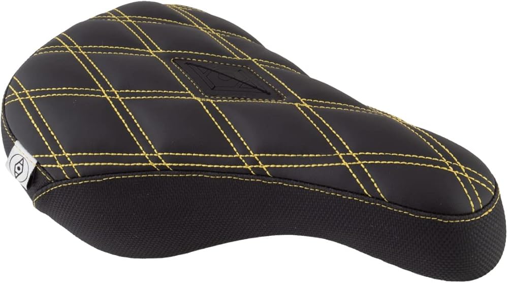 Upgrade your BMX ride with the Alienation Gripper BMX Saddle in eye-catching Gold, featuring a 140mm width pivotal design crafted for performance, durability, and style. This BMX-specific saddle combines innovative materials and engineering to enhance your riding experience whether you're hitting the trails, park, or street. Materials & Construction: Made from vegan tufted leather, the Alienation Gripper Saddle offers a cruelty-free alternative without compromising on style or durability. Its dense mid foam padding provides optimal comfort and support during intense BMX sessions. The saddle incorporates Dura-Grip side and rear panels, engineered from ultra-tough materials to resist wear and tear, ensuring longevity even in the most demanding riding conditions. Its welded construction replaces traditional press-fit techniques, delivering superior strength and reliability for aggressive riding styles. Performance & Engineering: Designed with BMX riders in mind, this saddle features a 235mm length and 140mm width, offering a balanced combination of support and maneuverability. The pivotal rail system allows for precise adjustments, ensuring a perfect fit and rider control. Double stitching throughout the cover enhances durability, making it resistant to the rigors of BMX riding. The flush pivotal bolt patch and hollow bolt design streamline installation and reduce weight for better performance. Components & Technology: Equipped with a motocross-inspired three-panel construction and dense foam core, the Alienation Gripper Saddle provides excellent shock absorption and rider comfort. The vegan leather top adds a luxurious look while maintaining eco-conscious standards, catering to riders seeking sustainable biking gear. The welded, double-stitched manufacturing ensures the saddle withstands aggressive landings, jumps, and tricks. Style & Use Case: With its bold gold finish and sleek pivotal design, this saddle is the perfect choice for freestyle BMX, street