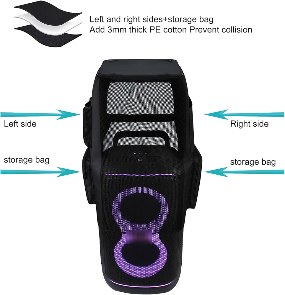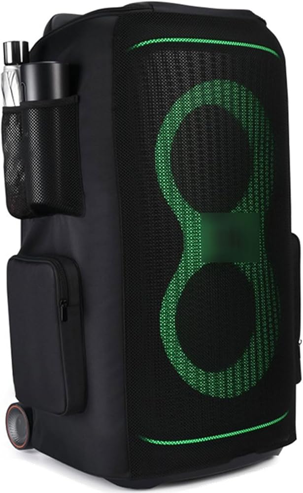 Specially designed dust cover case to compatible with JBL Partybox 520 speaker. The cover features a durable mesh construction that allows sound to flow freely while keeping dust and debris away from your valuable equipment. Convenient side pockets provide additional storage space for cables, remote controls, and other accessories. This multipurpose cover doubles as a storage sleeve when transporting or storing your speaker, helping to prevent scratches and damage.