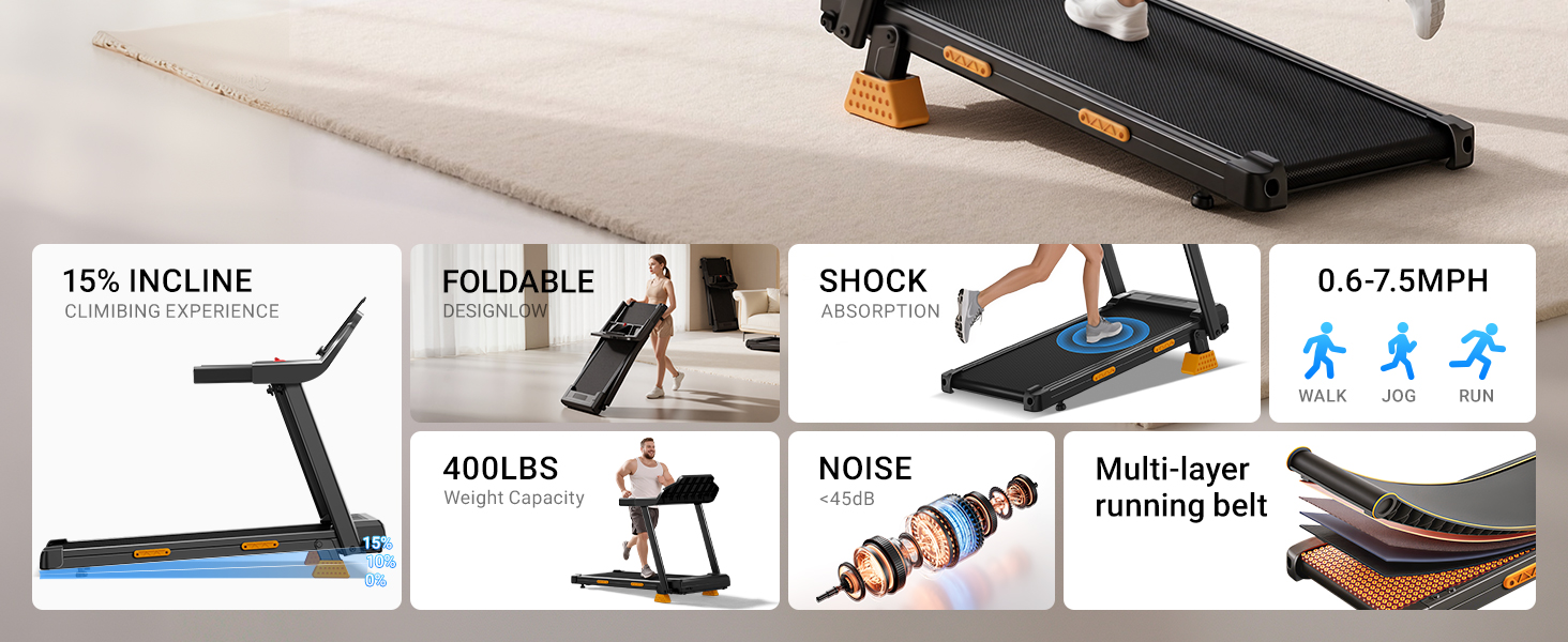 【400 LB Capacity & Joint-Protecting Shock Absorption】 The heavy-duty iron frame supports up to 400 LB, ensuring stability and durability. It boasts a wide running area up to 37.5IN x 15.0IN, providing ample space for comfortable movement. A multi-layer running belt paired with 4 built-in shock absorbers reduces impact on knees and joints, creating a smooth, comfortable running surface similar to outdoor ground, perfect for casual walking sessions