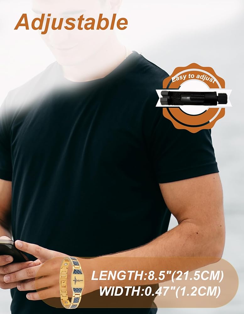 This stainless steel magnetic cross bracelet is designed for modern people. It combines stainless steel with 10 carbon fiber materials, which are rust-proof and corrosion-resistant, comfortable to wear and non-allergenic. It has 8 built-in 3500 gauss strong magnets to provide maximum effect. The cross is simple and generous, fashionable and versatile, suitable for all occasions. It is available in multiple colors and sizes, making it an ideal gift to express blessings and thoughts, suitable for all festivals and occasions. The bracelet is equipped with an adjustment tool, which can be easily adjusted according to personal needs to ensure comfortable and stable wearing. Whether it is for personal use or as a gift, it is an excellent choice.